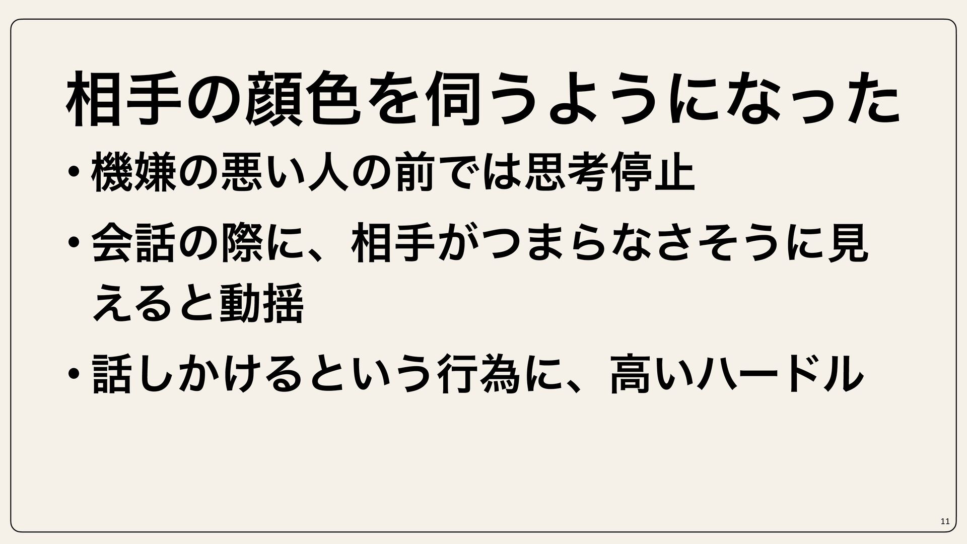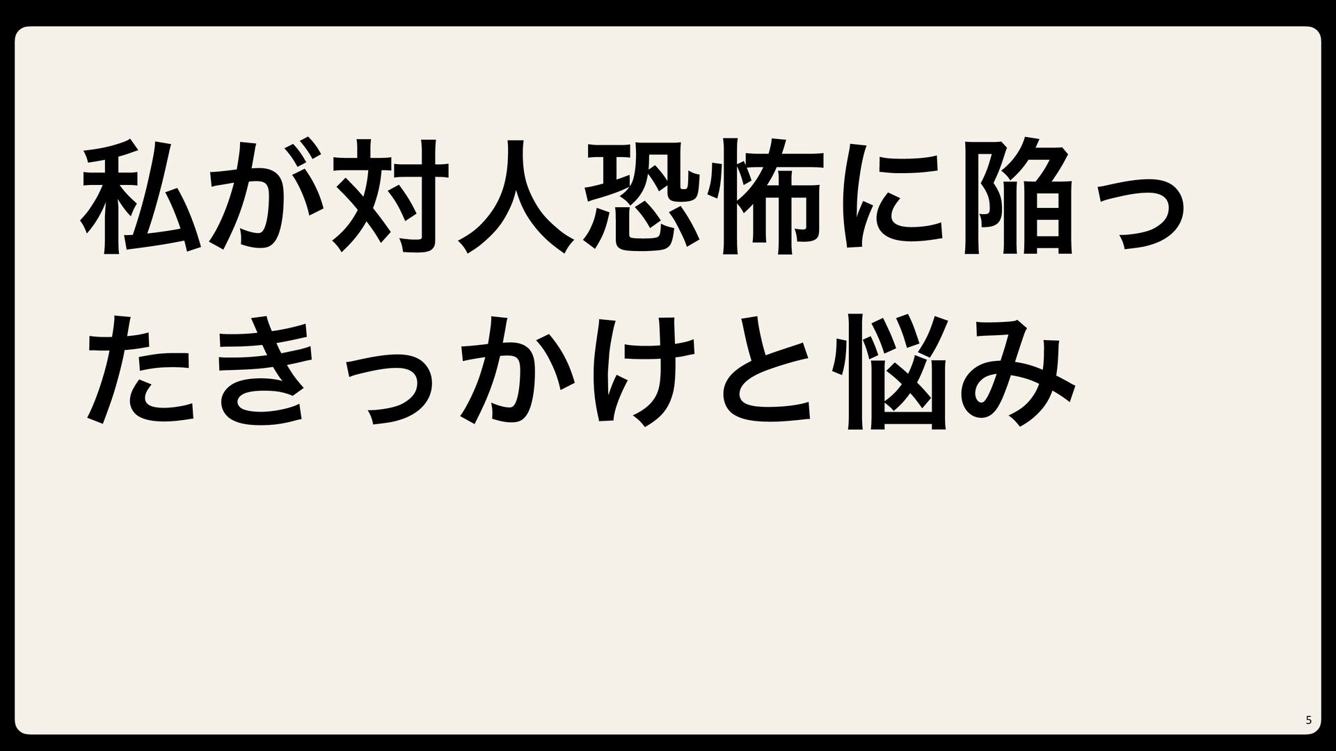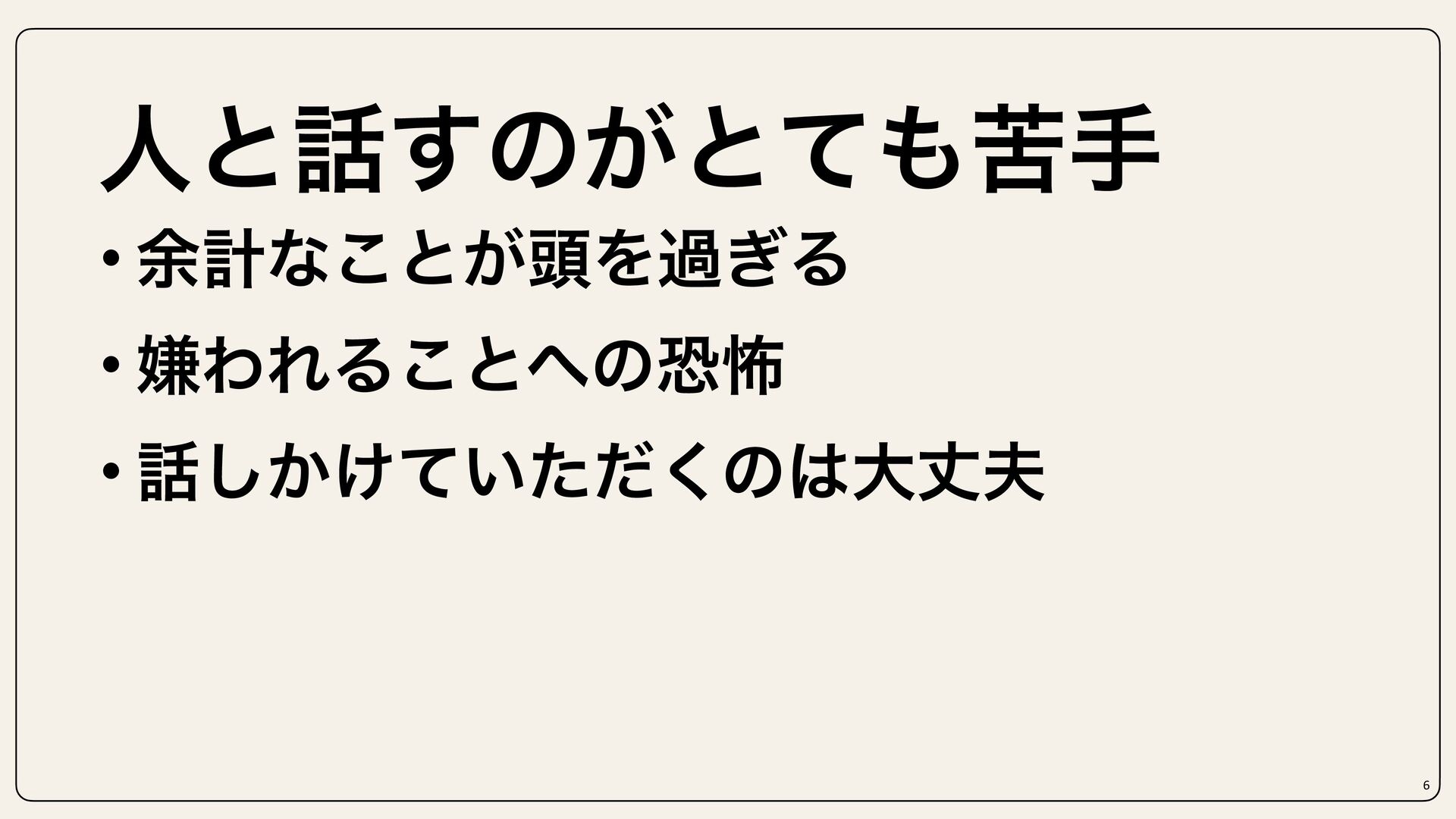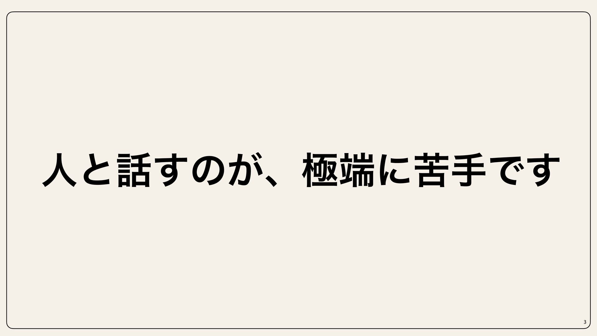 もともと口下手であり、極度に緊張してしまう性質のある私は、過去の辛い経験も相まって他人との会話が極度に苦手です。