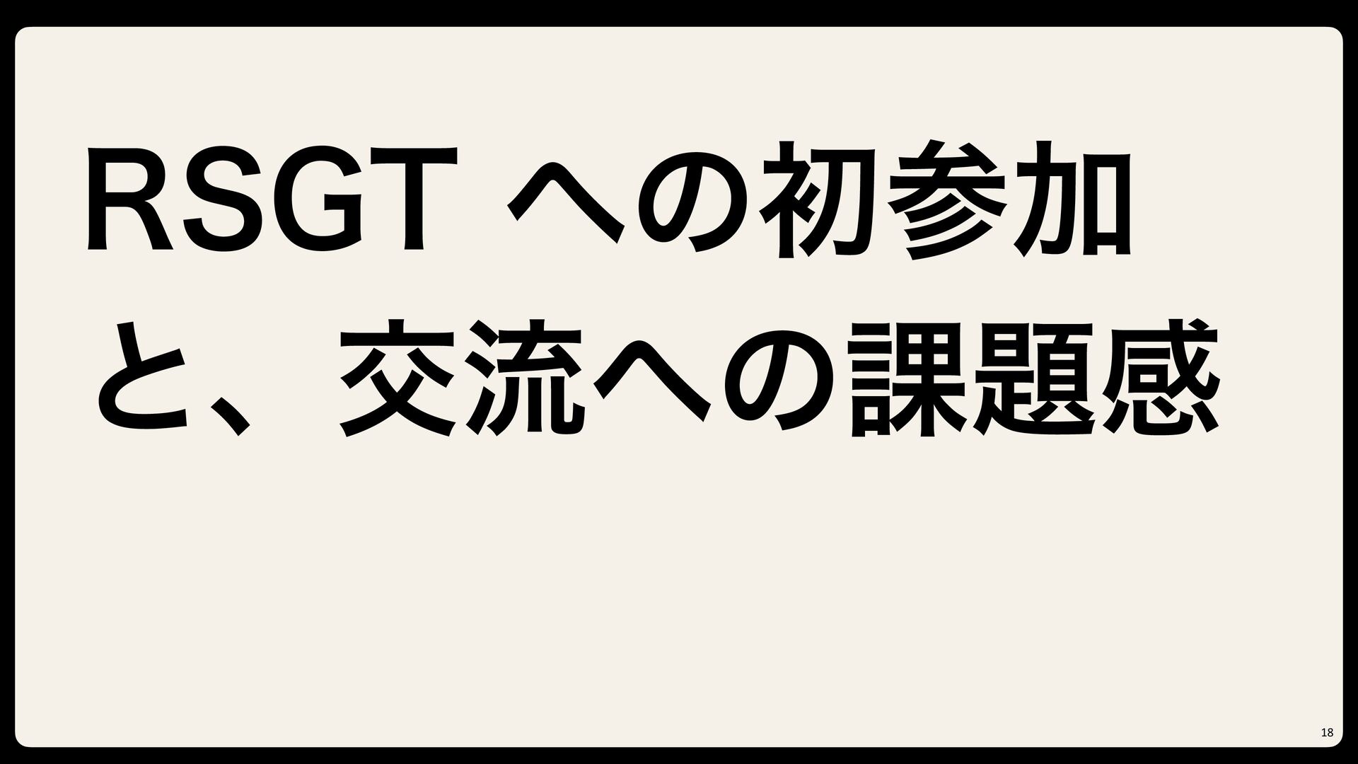 このセッションでは、RSGT という大規模なカンファレンスへ参加した際に私がどのようにして会話の恐怖を乗り越え、小さな成功体験を得たのか、その具体的なエピソードをお伝えします。