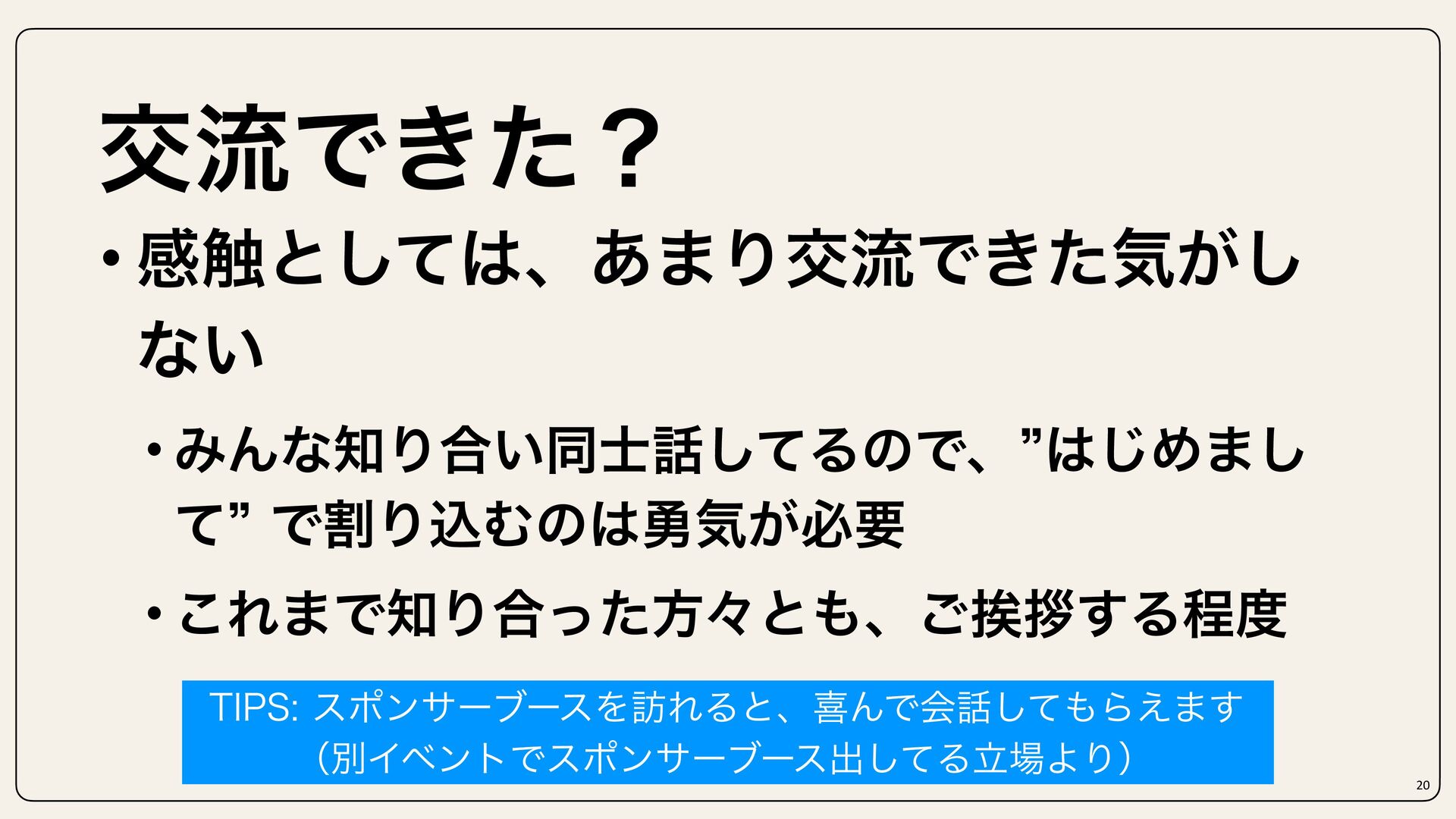 アジャイルのカンファレンスでは参加者のコミュニケーションが活発であり、会話に比較的参加しやすいのではないでしょうか。