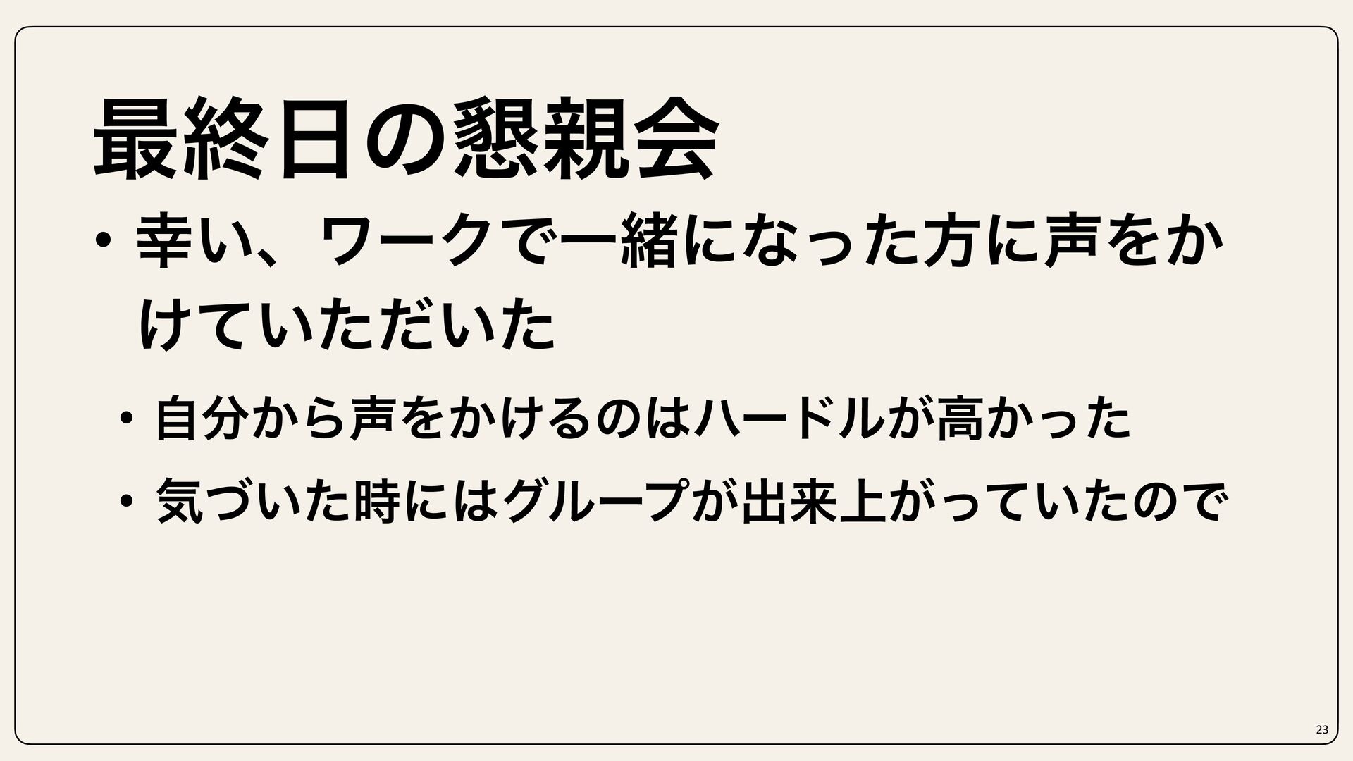 「勇気を持ってカンファレンスに参加したけど、懇親会などの場で会話のきっかけがつかめなくて誰とも話せなかった」