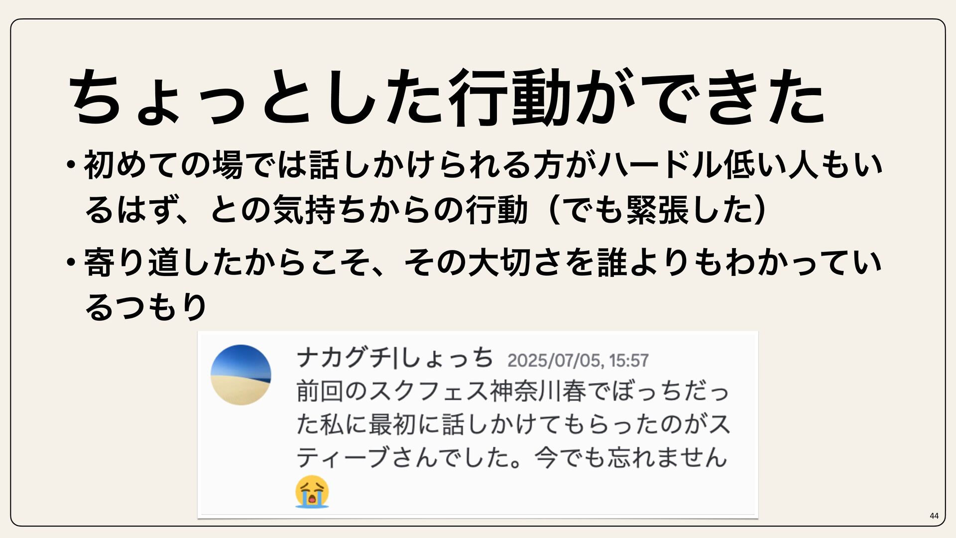 この発表から、かつての私と同じようにコミュニケーションに悩む方々に小さな一歩を踏み出すための「勇気」と「ヒント」を持ち帰っていただきたいです。