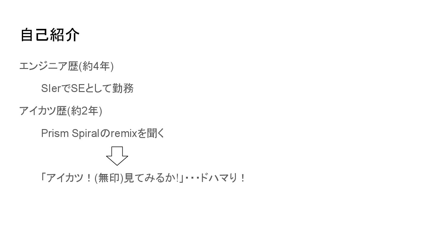 自己紹介 エンジニア歴(約4年) SIerでSEとして勤務 アイカツ歴(約2年) Prism Spiralのremixを聞く 「アイカツ!(無印)見てみるか!」・・・ドハマり!