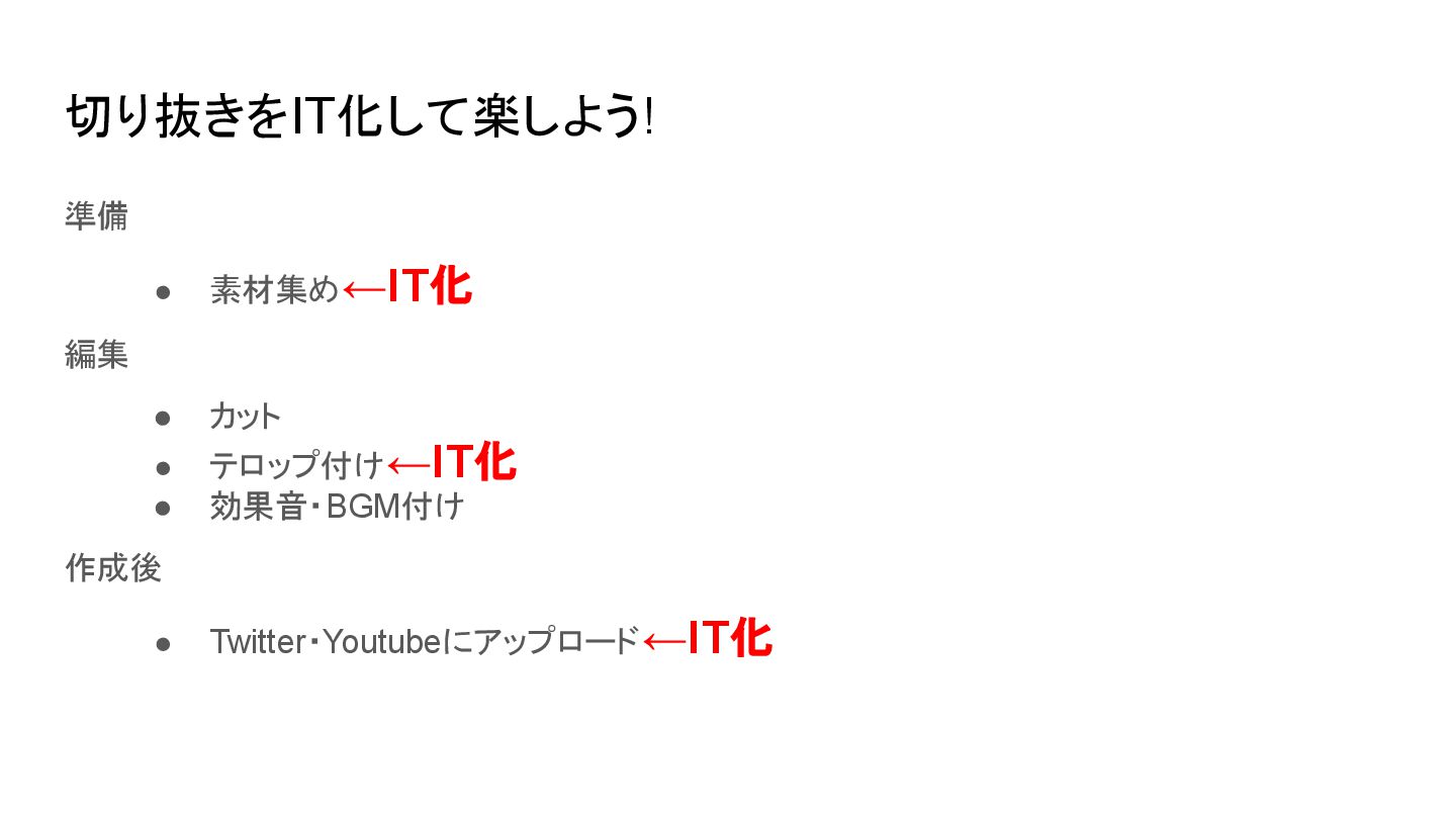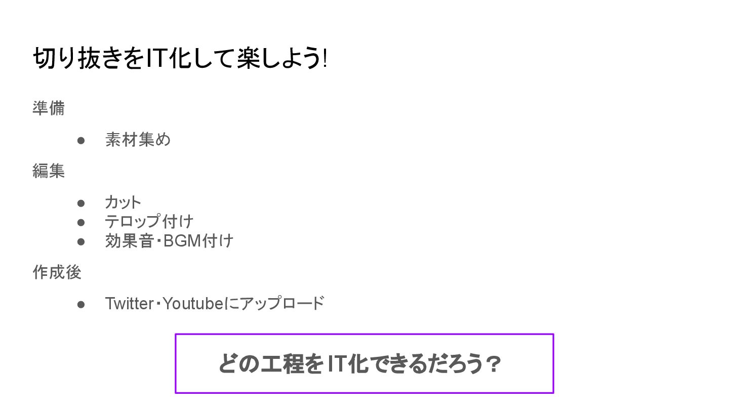 切り抜きをIT化して楽しよう! 準備 • 素材集め←IT化 編集 • カット • テロップ付け←IT化 •