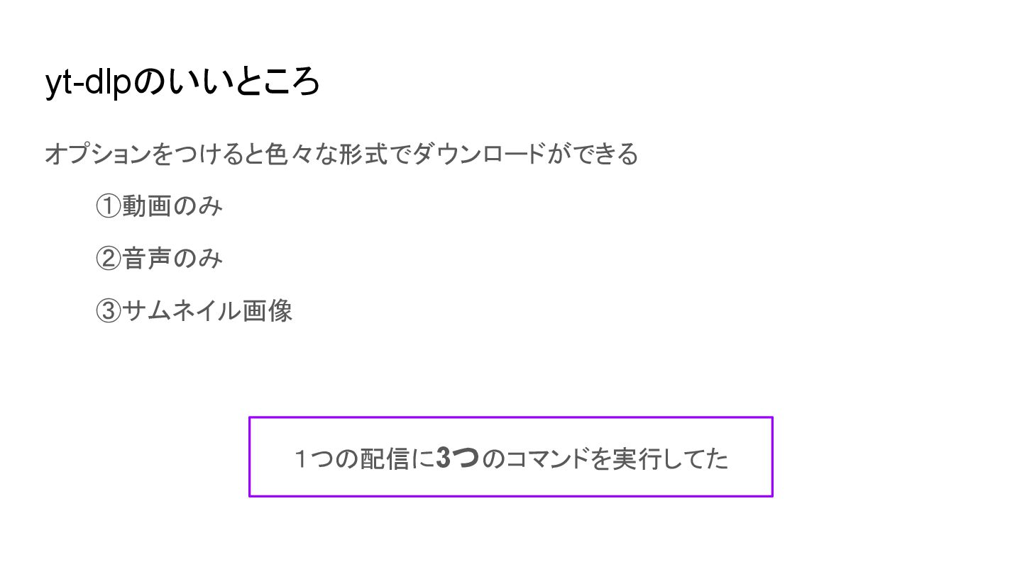 yt-dlpのいいところ オプションをつけると色々な形式でダウンロードができる ①動画のみ ②音声のみ ③サムネイル画像 1つの配信に3つのコマンドを実行してた