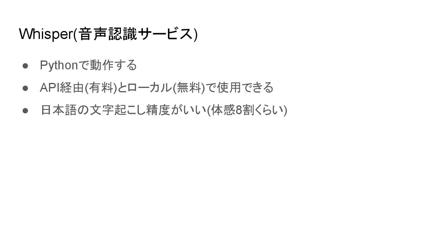 Whisper(音声認識サービス) • Pythonで動作する • API経由(有料)とローカル(無料)で使用できる • 日本語の文字起こし精度がいい(体感8割くらい)