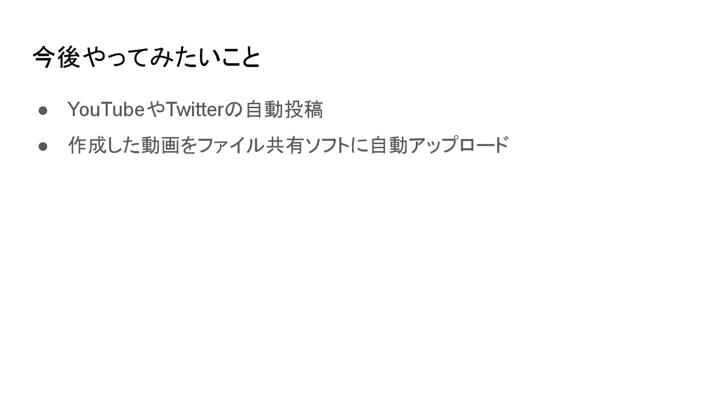 今後やってみたいこと • YouTubeやTwitterの自動投稿 • 作成した動画をファイル共有ソフトに自動アップロード