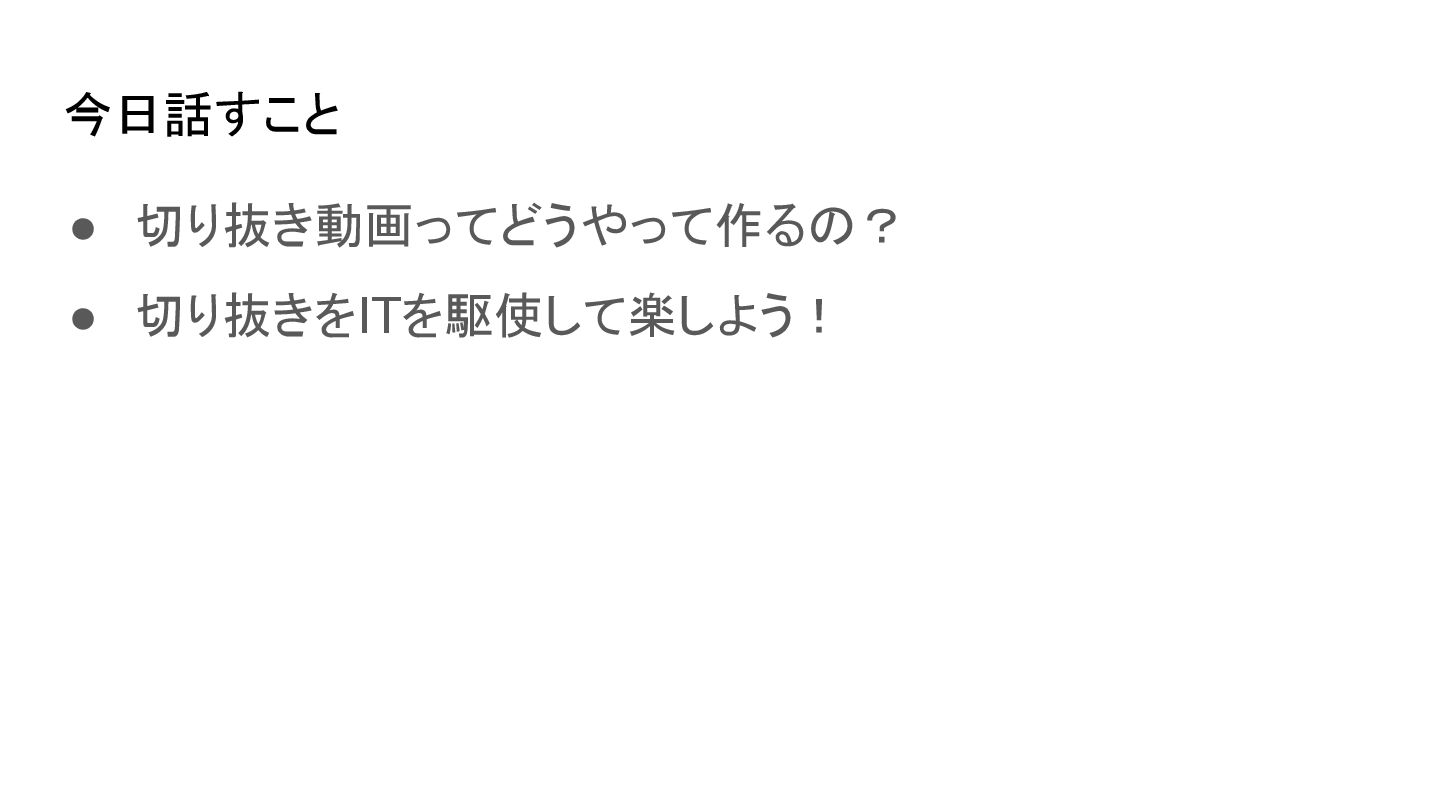 今日話すこと • 切り抜き動画ってどうやって作るの? • 切り抜きをITを駆使して楽しよう!