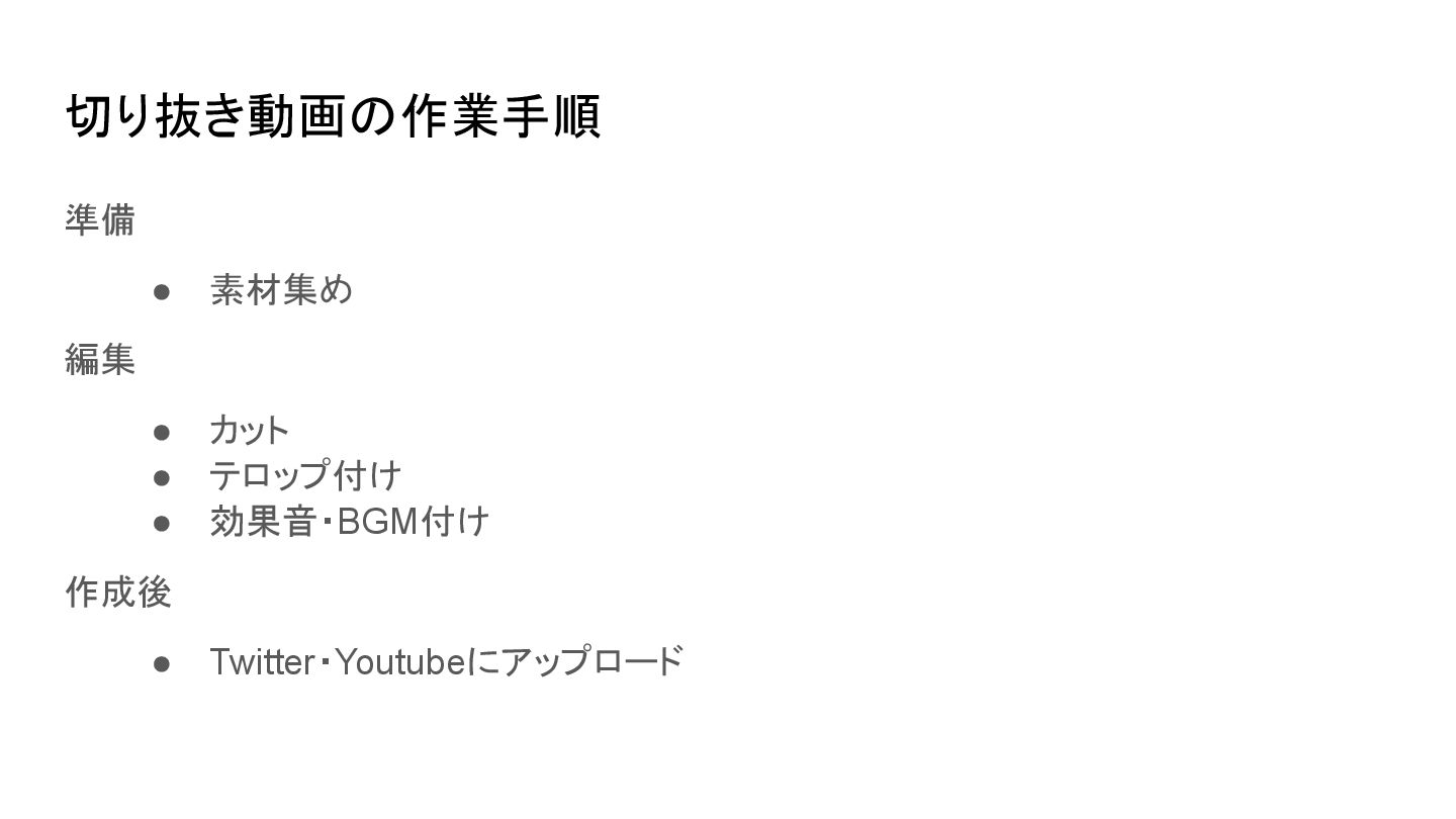 切り抜き動画の作業手順 準備 • 素材集め 編集 • カット • テロップ付け •