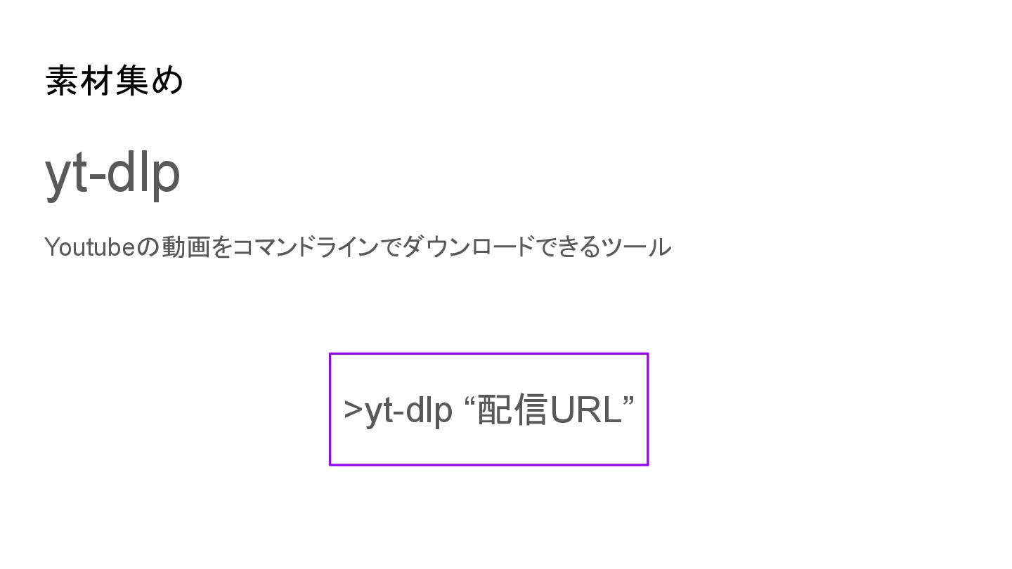 素材集め yt-dlp Youtubeの動画をコマンドラインでダウンロードできるツール >yt-dlp “配信URL”