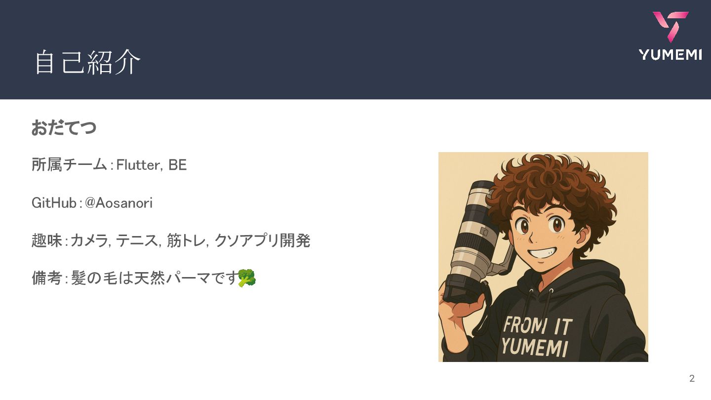 自己紹介 おだてつ 所属チーム:Flutter, BE GitHub:@Aosanori 趣味:カメラ, テニス, 筋トレ,