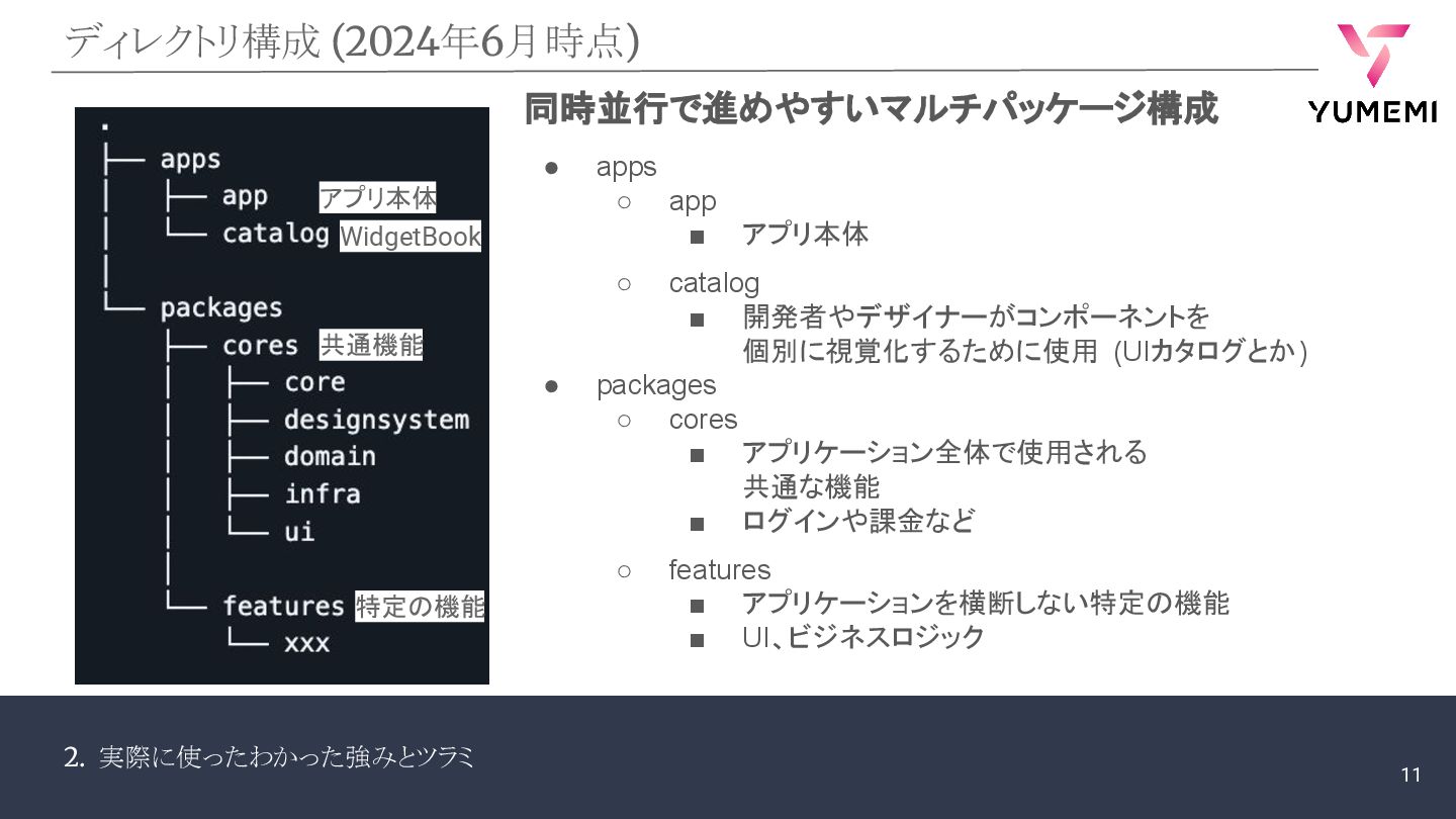 2. 実際に使ったわかった強みとツラミ ディレクトリ構成 (2024年6月時点) 同時並行で進めやすいマルチパッケージ構成 • apps ◦ app ▪