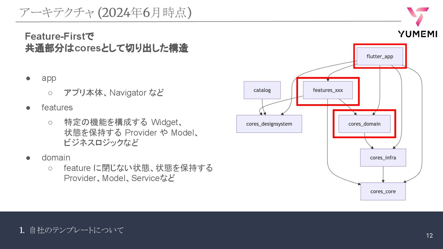 アプリ本体 ◦ catalog ▪ 開発者やデザイナーがコンポーネントを 個別に視覚化するために使用 (UIカタログとか) • packages ◦ cores ▪ アプリケーション全体で使用される 共通な機能 ▪ ログインや課金など ◦ features ▪ アプリケーションを横断しない特定の機能 ▪ UI、ビジネスロジック アプリ本体 WidgetBook 共通機能 特定の機能 11