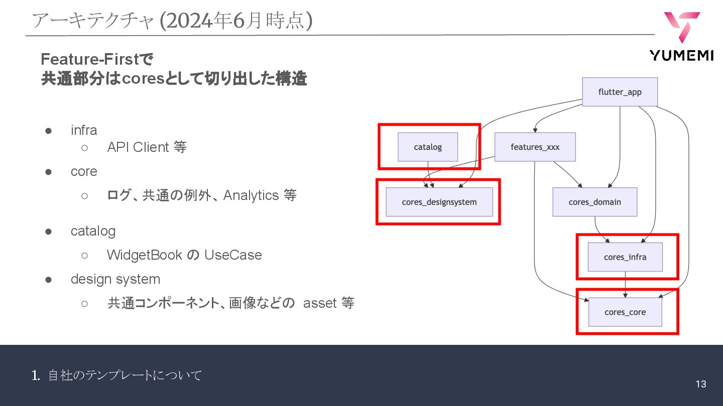features ◦ 特定の機能を構成する Widget、 状態を保持する Provider や Model、 ビジネスロジックなど • domain ◦ feature に閉じない状態、状態を保持する Provider、Model、Serviceなど Feature-Firstで 共通部分はcoresとして切り出した構造 12