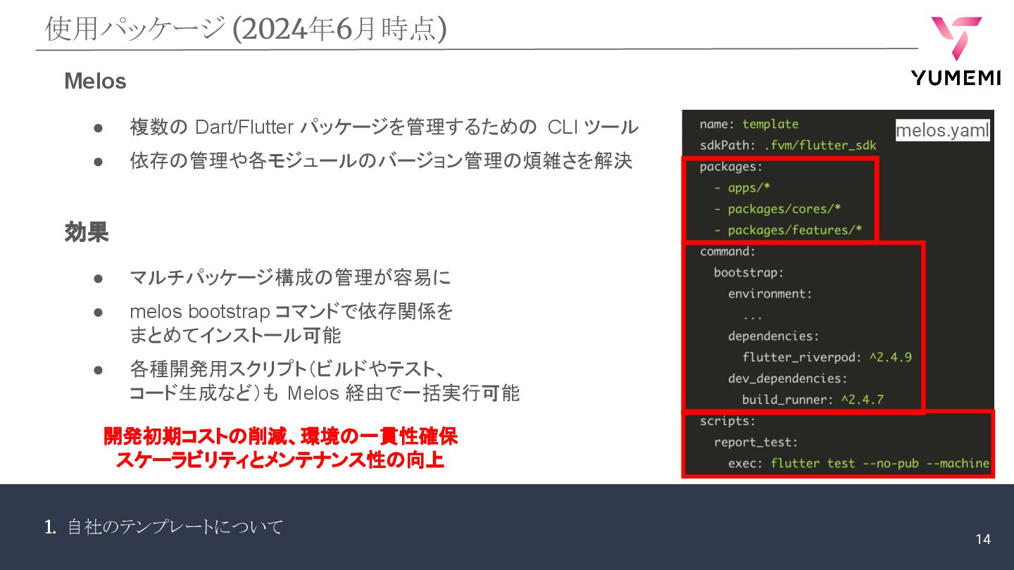 1. 自社のテンプレートについて 使用パッケージ (2024年6月時点) Melos • 複数の Dart/Flutter パッケージを管理するための CLI