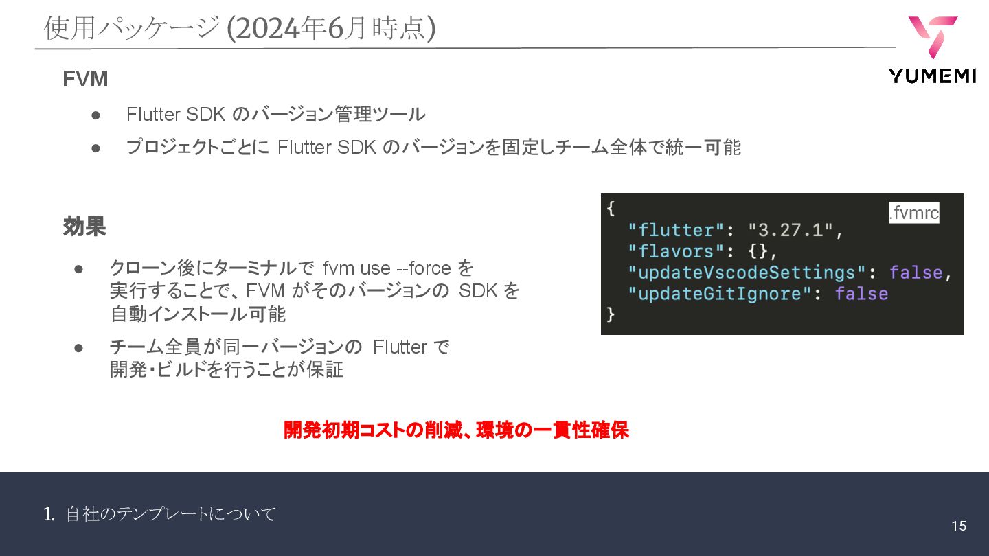 1. 自社のテンプレートについて 使用パッケージ (2024年6月時点) FVM • Flutter SDK のバージョン管理ツール •