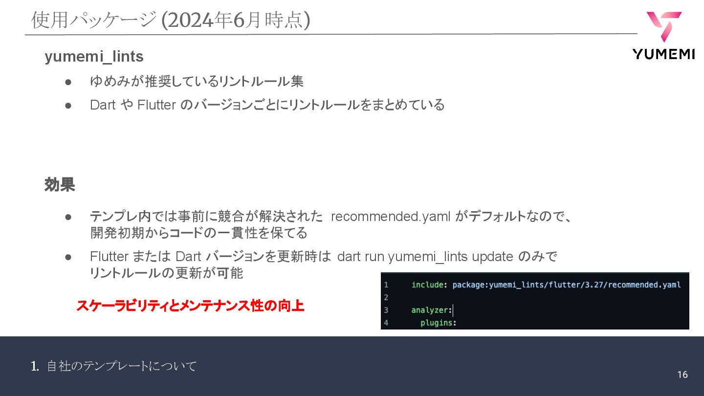 1. 自社のテンプレートについて 使用パッケージ (2024年6月時点) yumemi_lints • ゆめみが推奨しているリントルール集 • Dart や