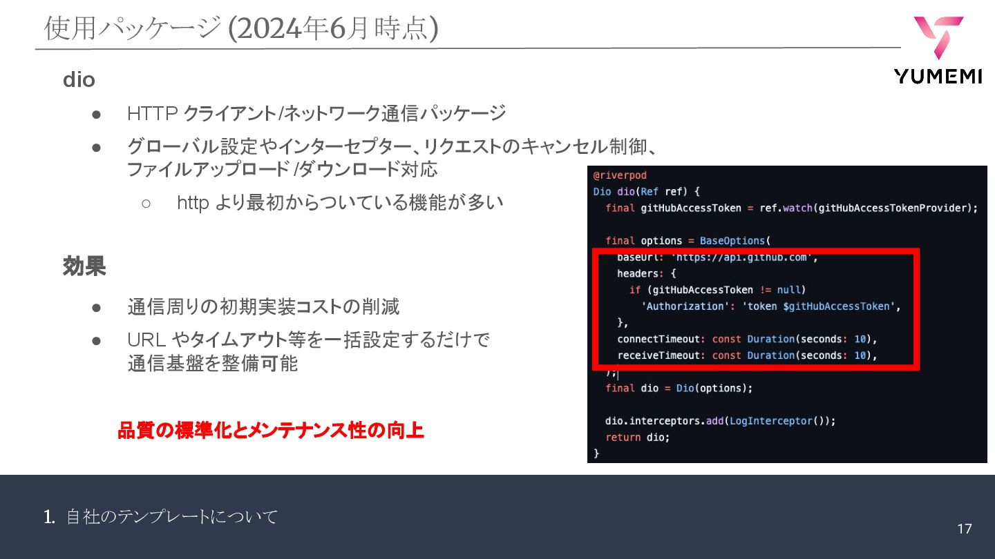 1. 自社のテンプレートについて 使用パッケージ (2024年6月時点) dio • HTTP クライアント/ネットワーク通信パッケージ • グローバル設定やインターセプター、リクエストのキャンセル制御、