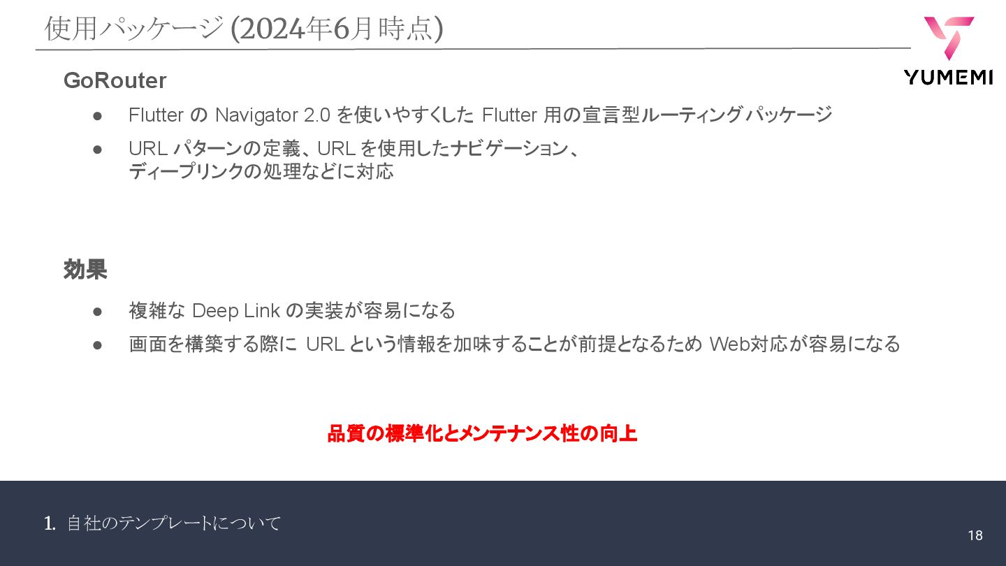 1. 自社のテンプレートについて 使用パッケージ (2024年6月時点) GoRouter • Flutter の Navigator 2.0