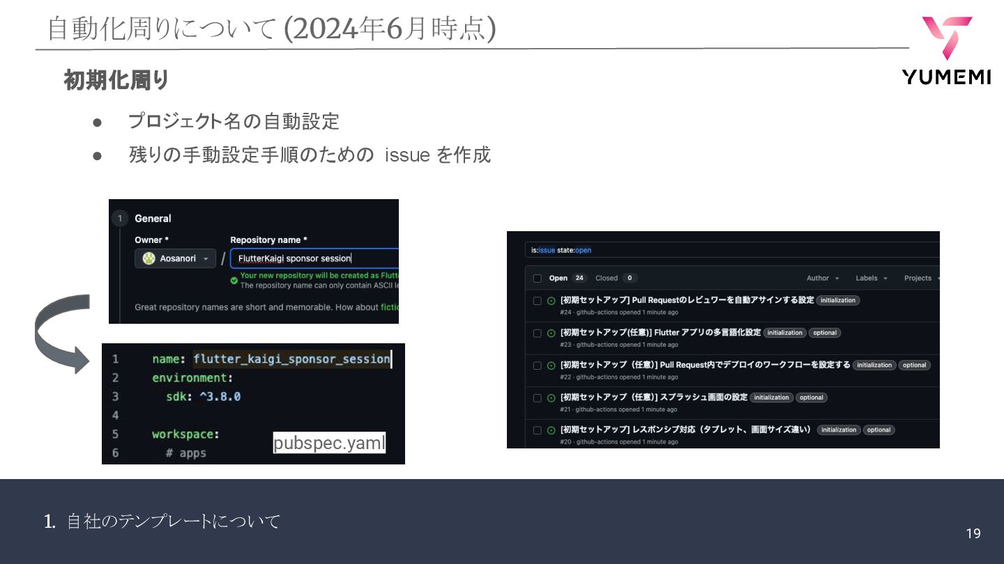 1. 自社のテンプレートについて 自動化周りについて (2024年6月時点) 初期化周り • プロジェクト名の自動設定 • 残りの手動設定手順のための issue