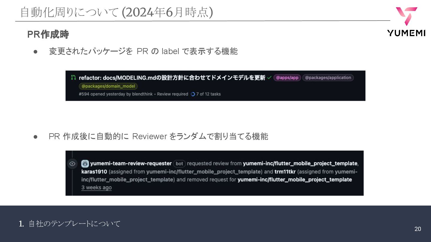 1. 自社のテンプレートについて 自動化周りについて (2024年6月時点) PR作成時 • 変更されたパッケージを PR の label