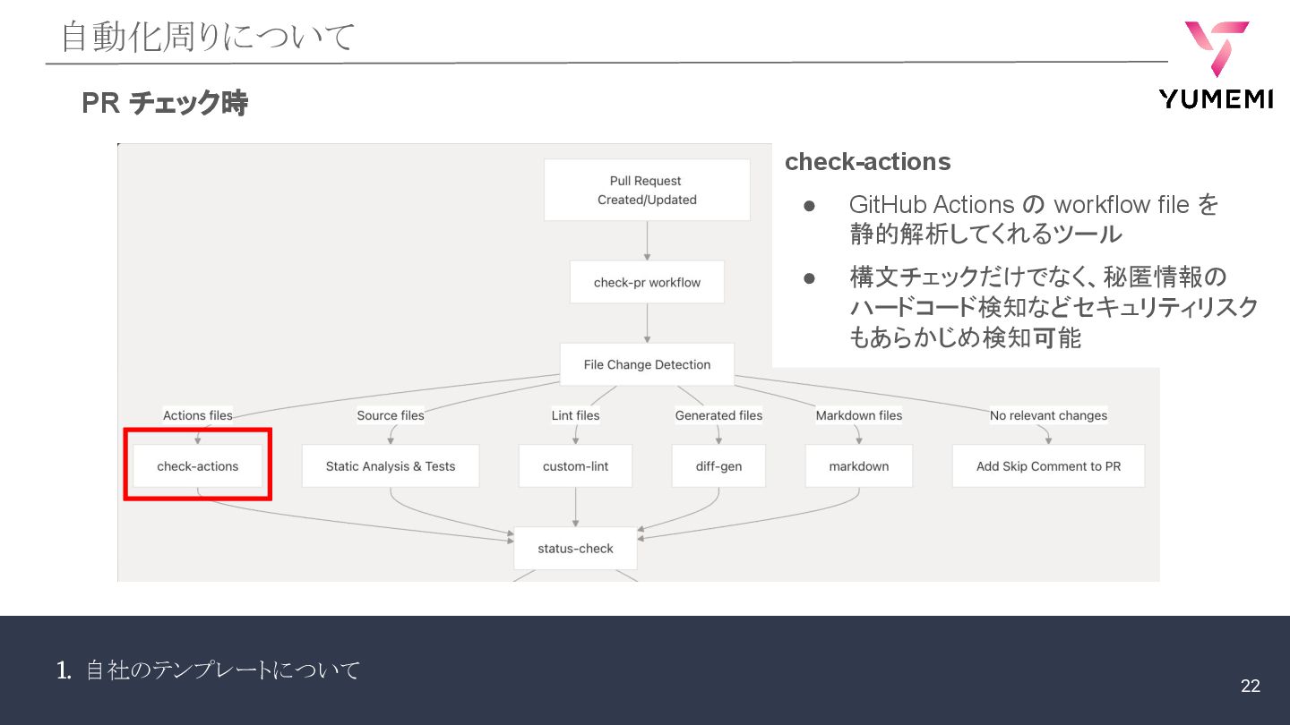 1. 自社のテンプレートについて 自動化周りについて PR チェック時 check-actions • GitHub Actions の