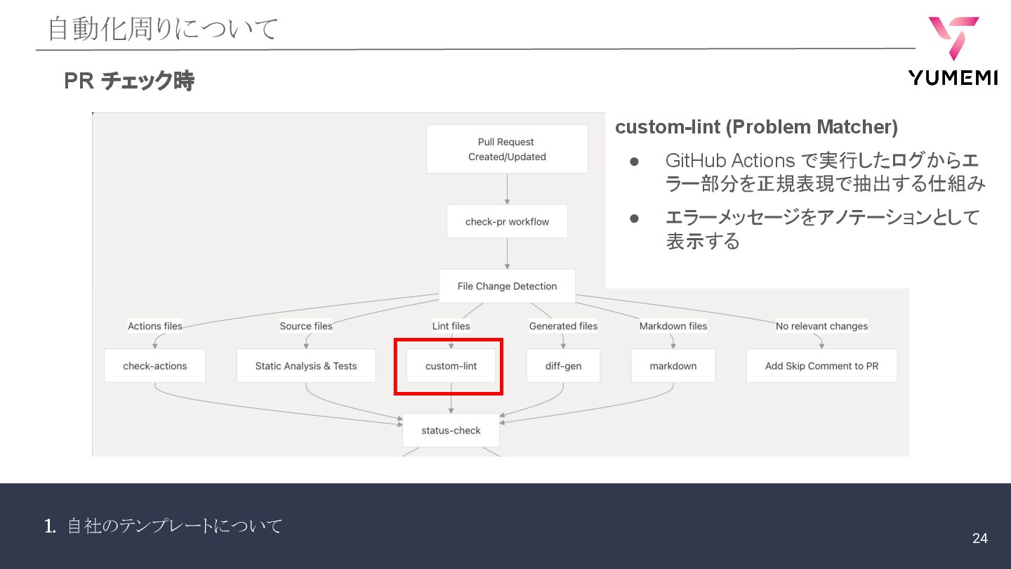 1. 自社のテンプレートについて 自動化周りについて PR チェック時 custom-lint (Problem Matcher) • GitHub