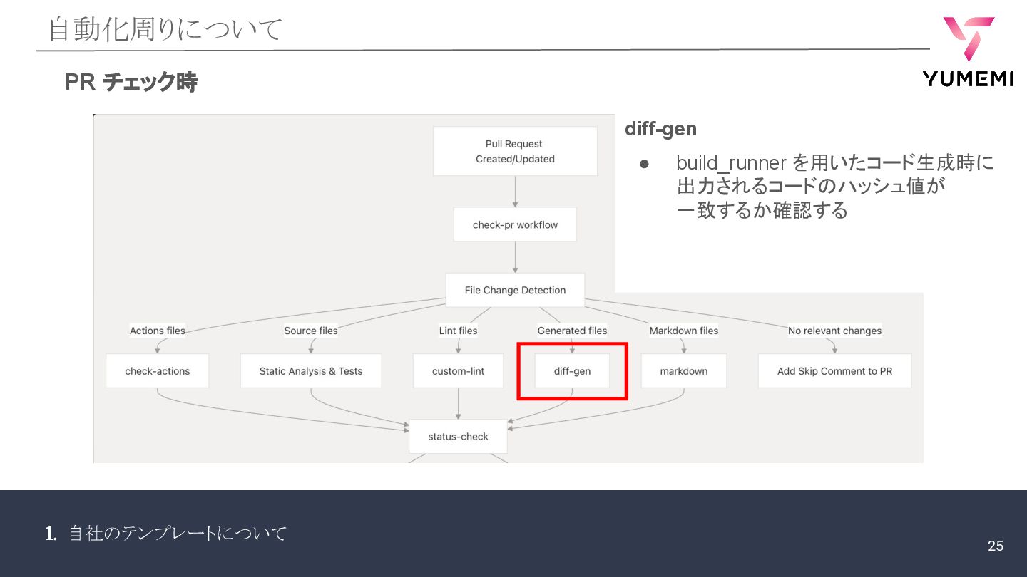 1. 自社のテンプレートについて 自動化周りについて PR チェック時 diff-gen • build_runner を用いたコード生成時に 出力されるコードのハッシュ値が