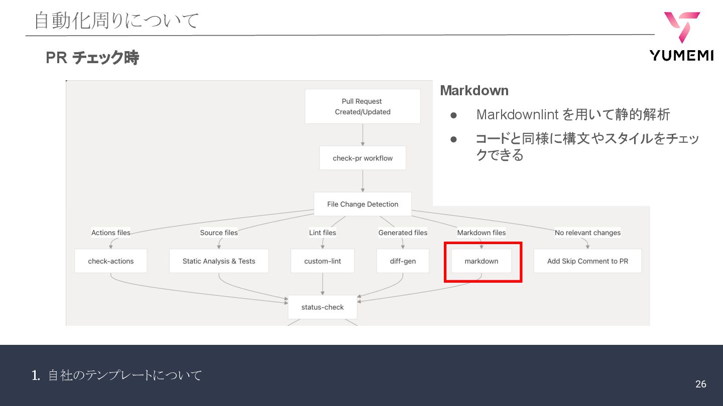 1. 自社のテンプレートについて 自動化周りについて PR チェック時 • markdownlint • 品 •