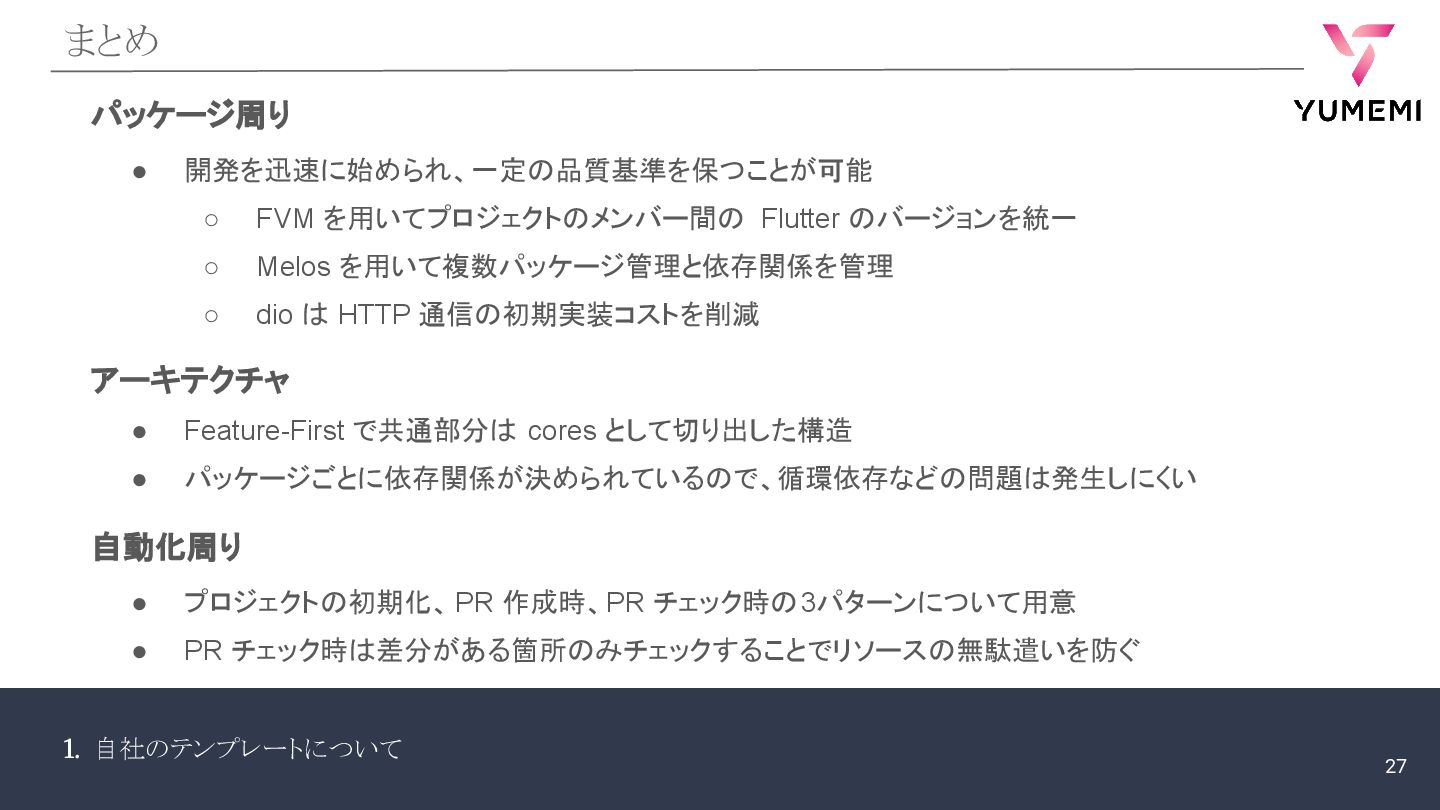 1. 自社のテンプレートについて まとめ パッケージ周り • 開発を迅速に始められ、一定の品質基準を保つことが可能 ◦ FVM を用いてプロジェクトのメンバー間の Flutter