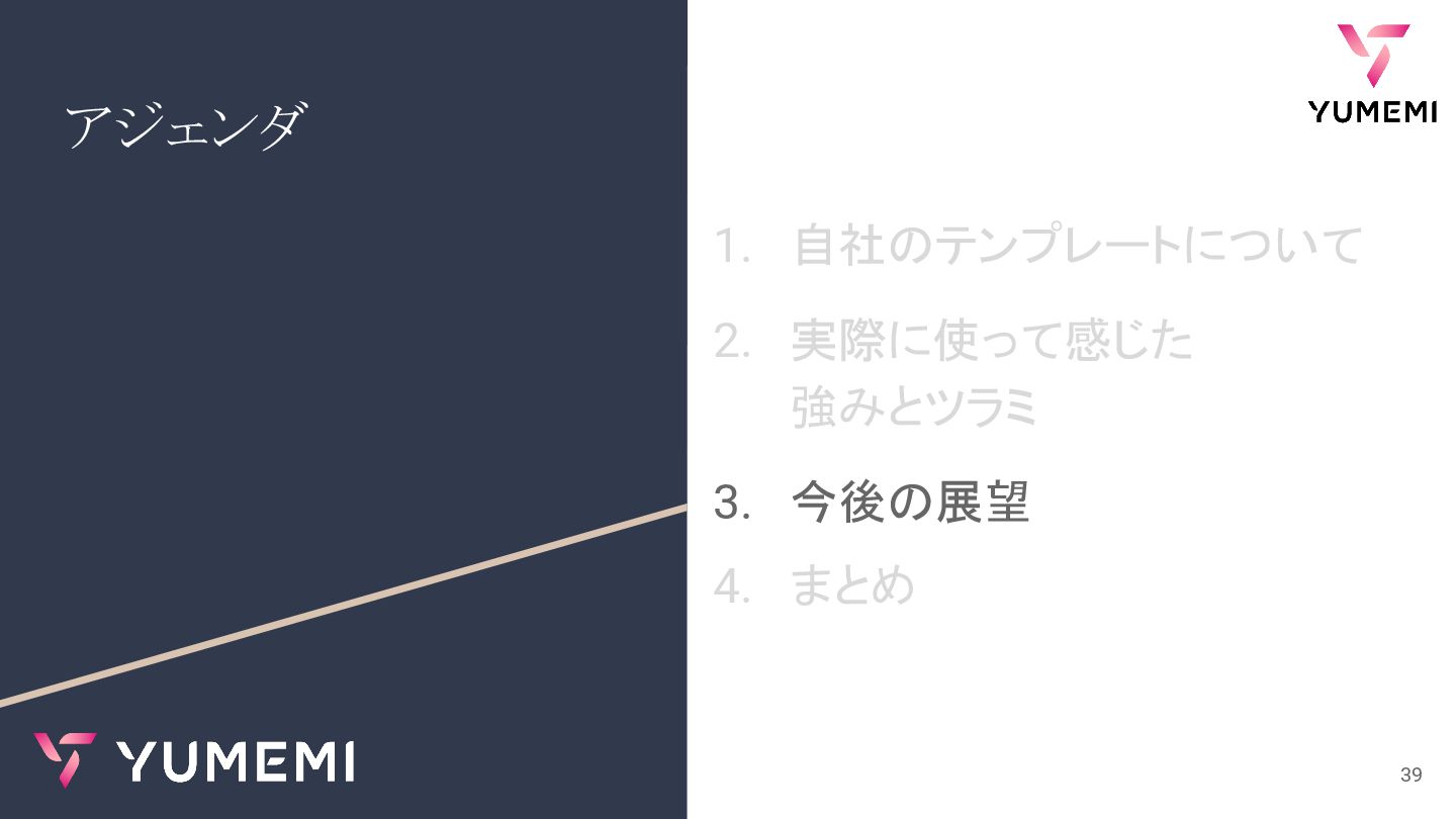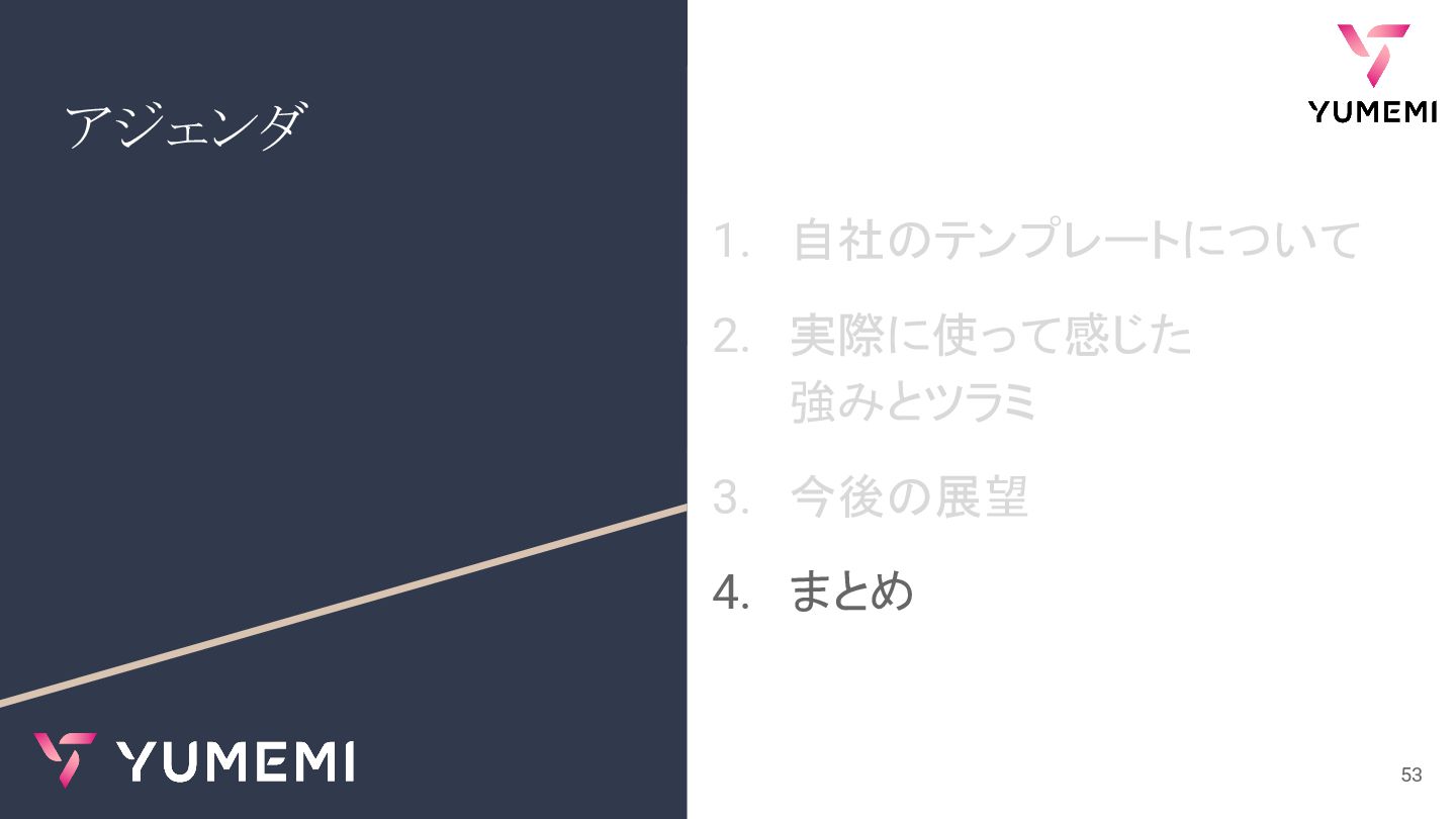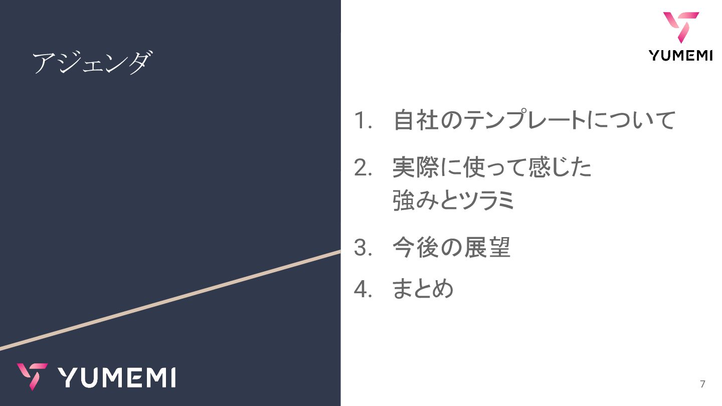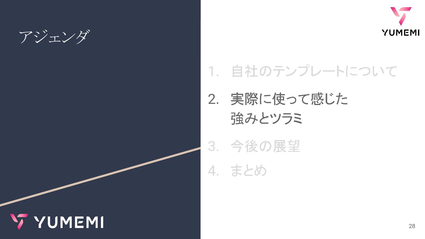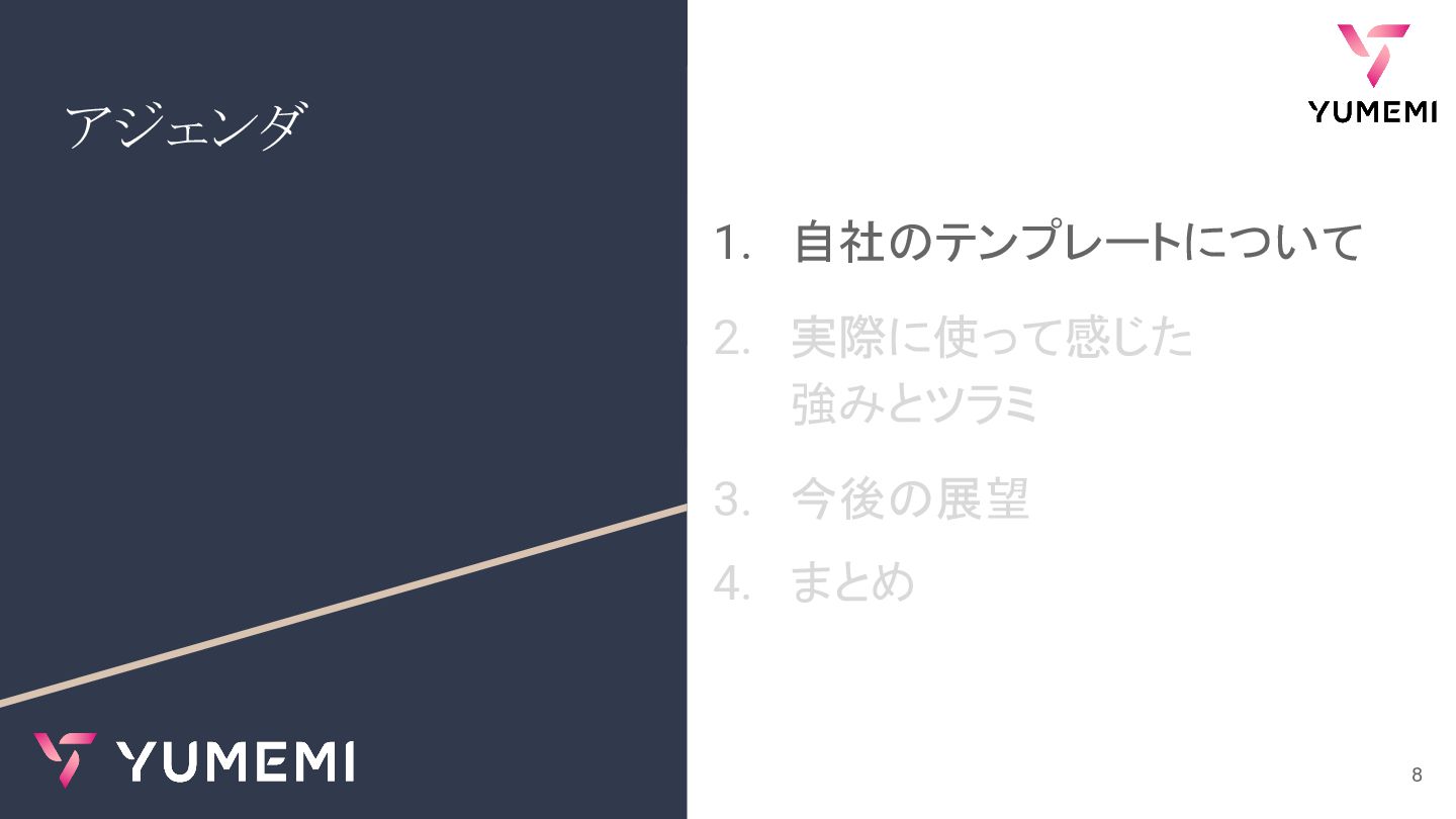 アジェンダ 1. 自社のテンプレートについて 2. 実際に使って感じた 強みとツラミ 3. 今後の展望 4. まとめ