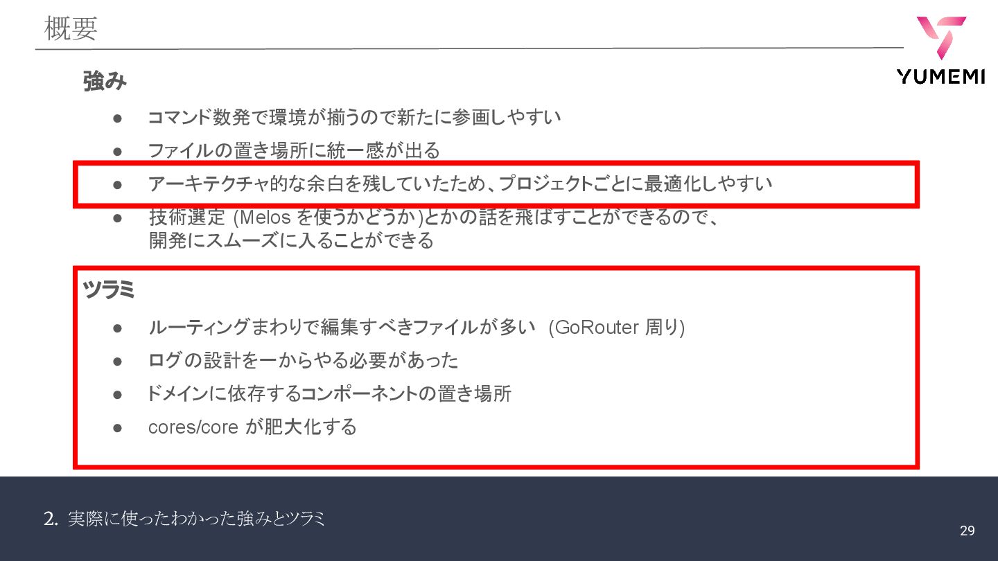 2. 実際に使ったわかった強みとツラミ まとめ ルーティングまわり ログ設計 ドメインに依存するコンポーネントの置き場所 cores/core の肥大化 • 追加