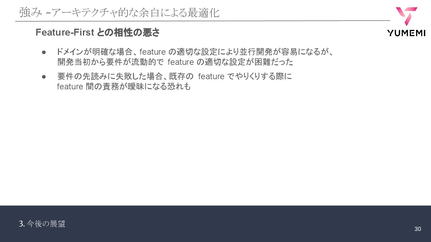 3. 今後の展望 強み -アーキテクチャ的な余白による最適化 Feature-First との相性の悪さ • ドメインが明確な場合、 feature の適切な設定により並行開発が容易になるが、