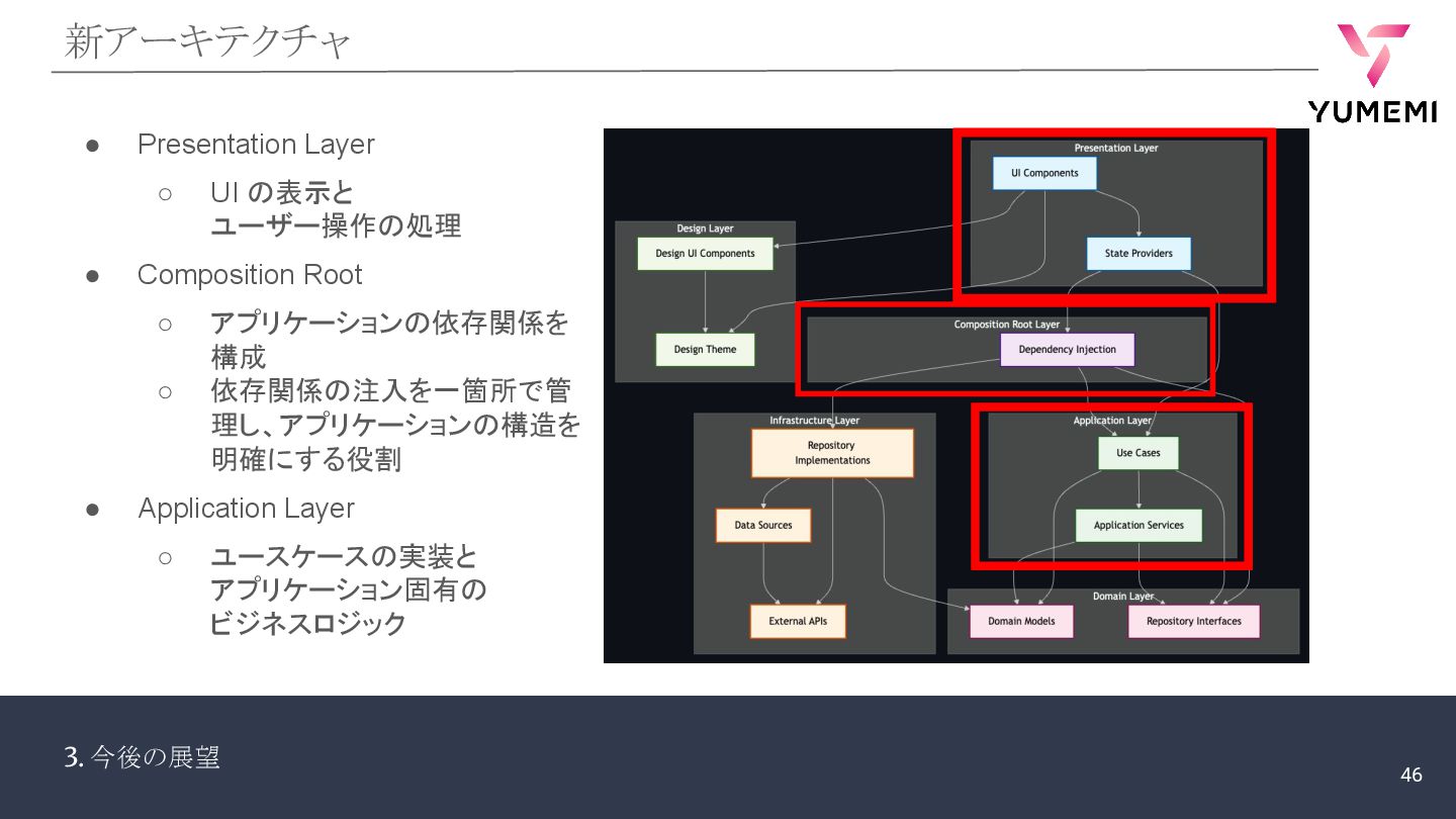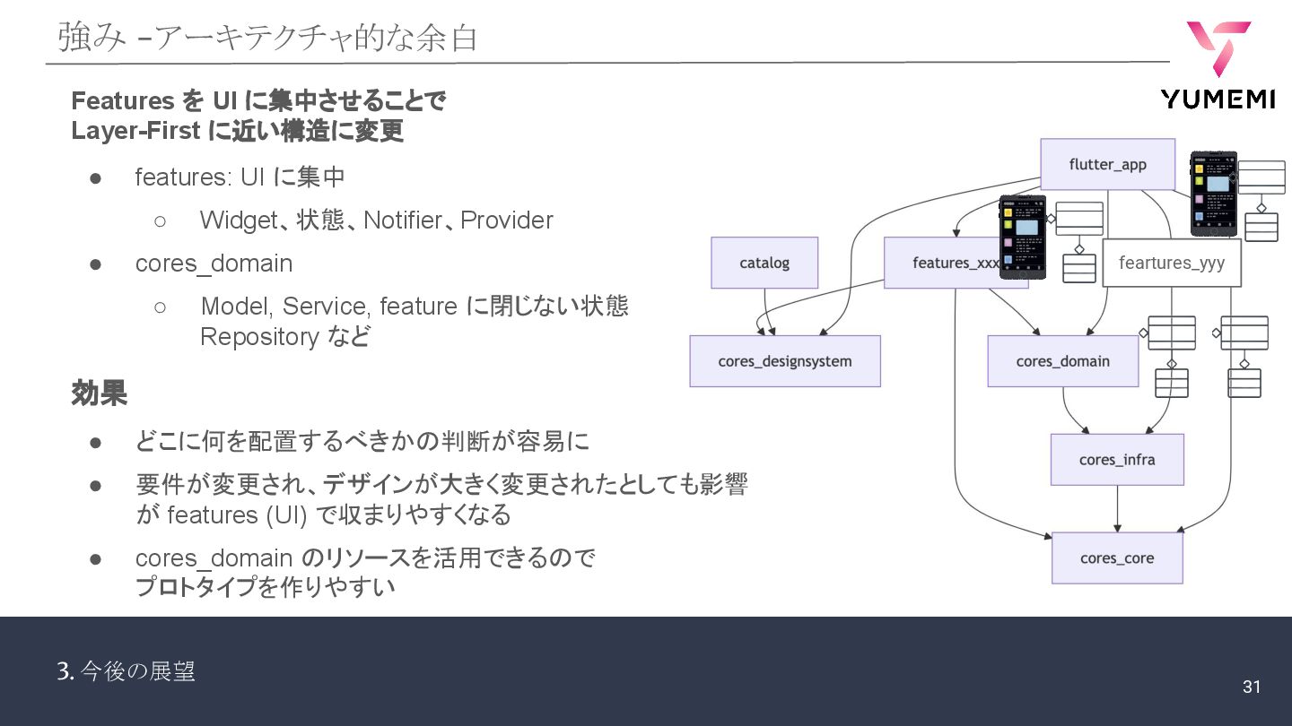 3. 今後の展望 強み -アーキテクチャ的な余白 • features: UI に集中 ◦ Widget、状態、Notifier、Provider