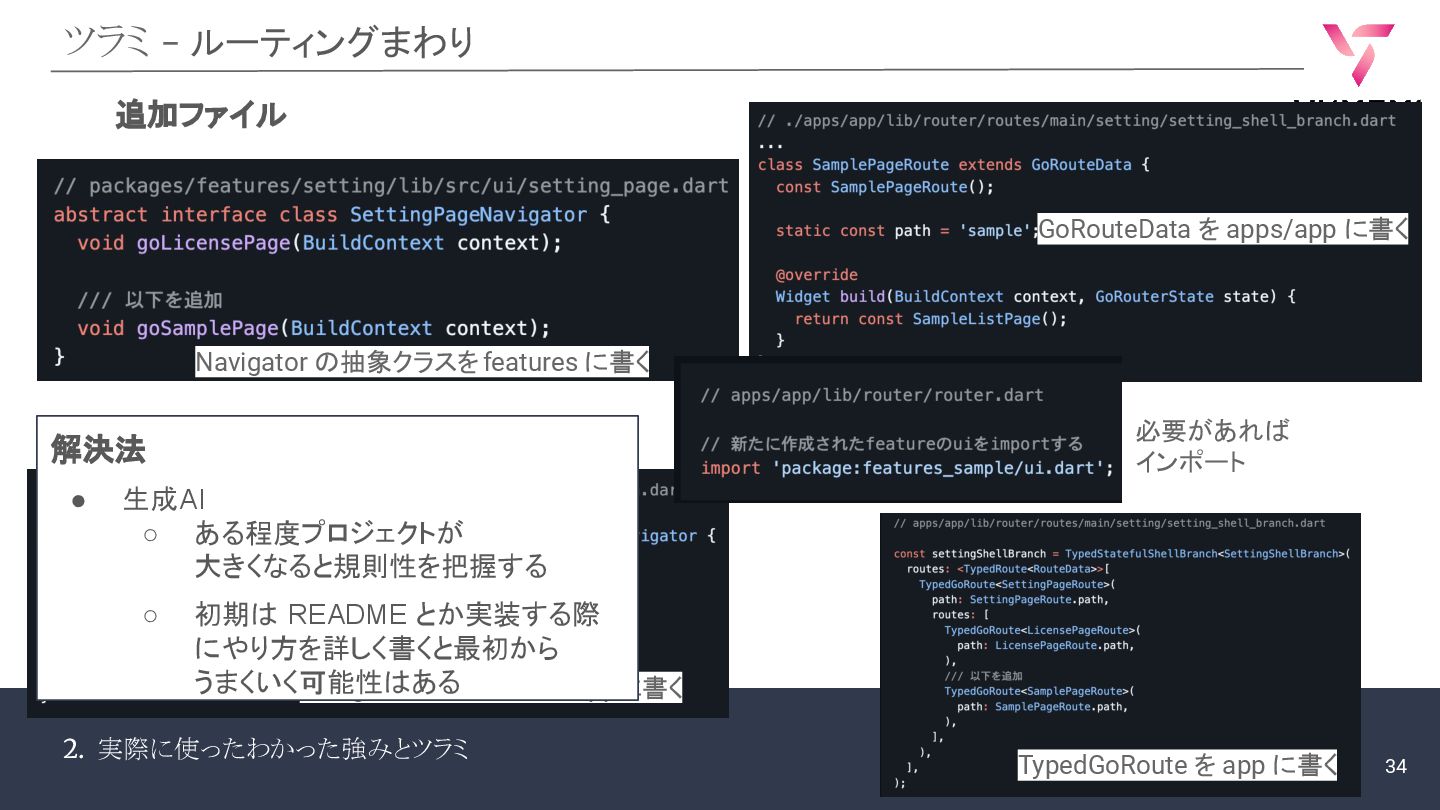 Navigatorの実装クラスをappに書く TypedGoRoute を app に書く GoRouteData を apps/app に書く 必要があれば インポート 解決法 • 生成AI ◦ ある程度プロジェクトが 大きくなると規則性を把握する ◦ 初期は README とか実装する際 にやり方を詳しく書くと最初から うまくいく可能性はある 34