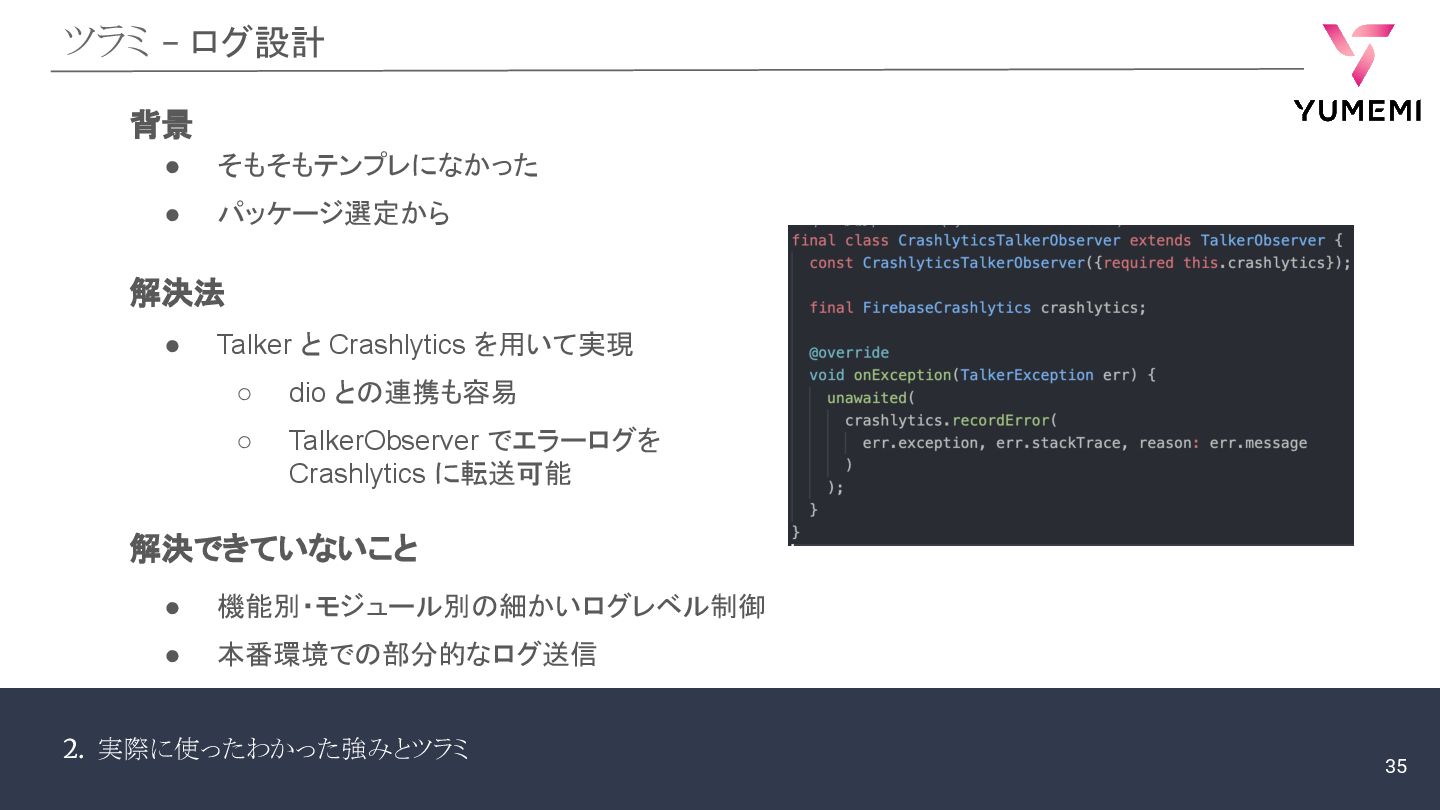 そもそもテンプレになかった • パッケージ選定から 背景 • Talker と Crashlytics を用いて実現 ◦ dio との連携も容易 ◦ TalkerObserver でエラーログを Crashlytics に転送可能 解決法 解決できていないこと 35