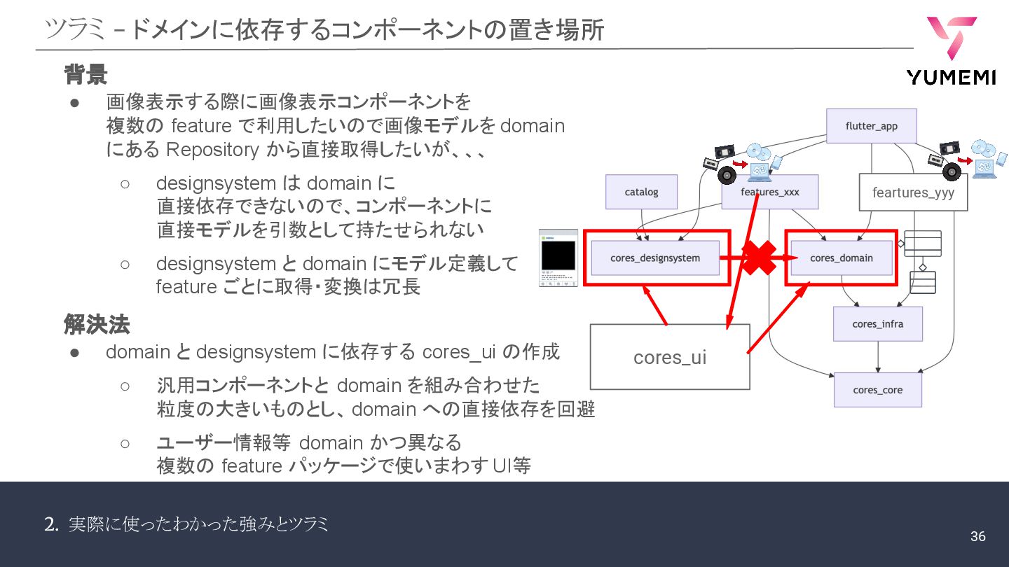 domain にある Repository から直接取得したいが、、、 ◦ designsystem は domain に 直接依存できないので、コンポーネントに 直接モデルを引数として持たせられない ◦ designsystem と domain にモデル定義して feature ごとに取得・変換は冗長 背景 • domain と designsystem に依存する cores_ui の作成 ◦ 汎用コンポーネントと domain を組み合わせた 粒度の大きいものとし、 domain への直接依存を回避 ◦ ユーザー情報等 domain かつ異なる 複数の feature パッケージで使いまわす UI等 解決法 cores_ui 36 feartures_yyy