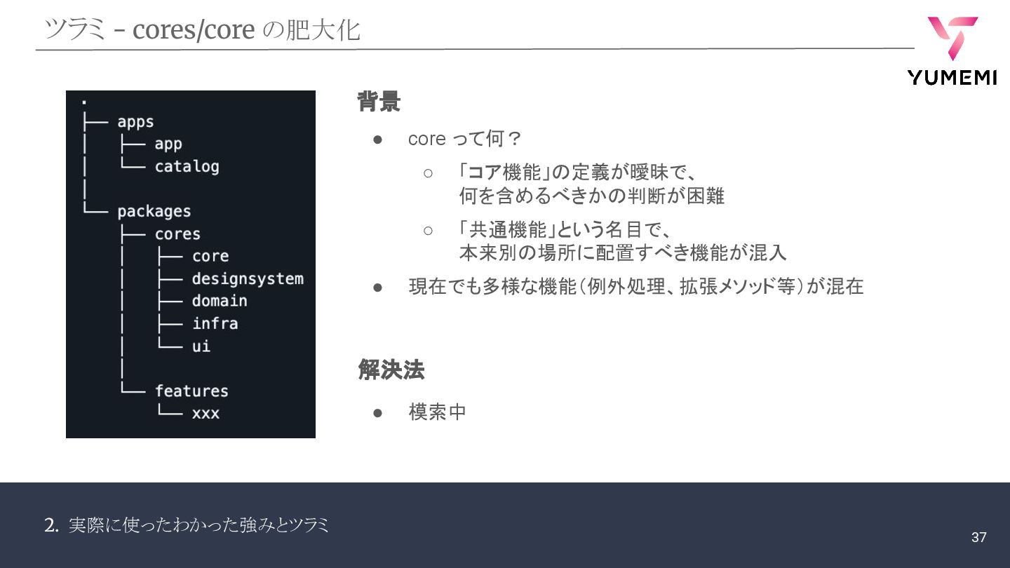 「コア機能」の定義が曖昧で、 何を含めるべきかの判断が困難 ◦ 「共通機能」という名目で、 本来別の場所に配置すべき機能が混入 • 現在でも多様な機能(例外処理、拡張メソッド等)が混在 • 模索中 背景 解決法 37