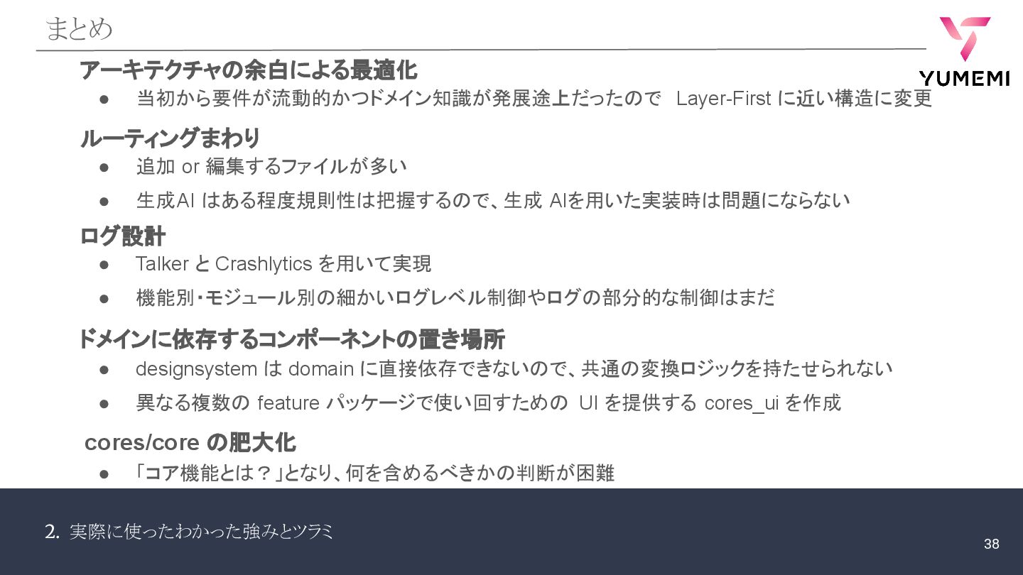or 編集するファイルが多い • 生成AI はある程度規則性は把握するので、生成 AIを用いた実装時は問題にならない • Talker と Crashlytics を用いて実現 • 機能別・モジュール別の細かいログレベル制御やログの部分的な制御はまだ • designsystem は domain に直接依存できないので、共通の変換ロジックを持たせられない • 異なる複数の feature パッケージで使い回すための UI を提供する cores_ui を作成 • 「コア機能とは?」となり、何を含めるべきかの判断が困難 アーキテクチャの余白による最適化 • 当初から要件が流動的かつドメイン知識が発展途上だったので Layer-First に近い構造に変更 38