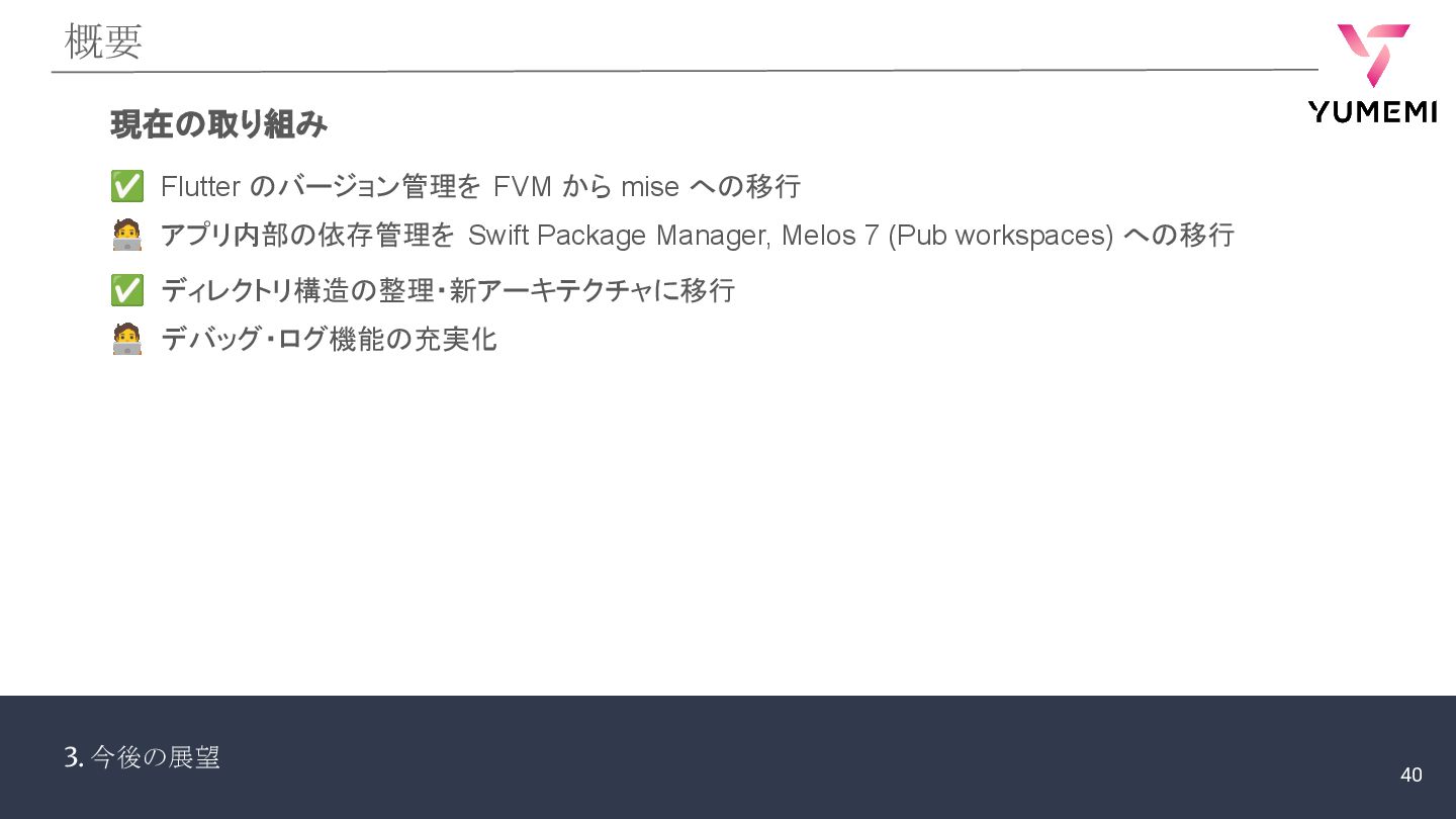 アプリ内部の依存管理を Swift Package Manager, Melos 7 (Pub workspaces) への移行 ✅ ディレクトリ構造の整理・新アーキテクチャに移行 デバッグ・ログ機能の充実化 現在の取り組み 40