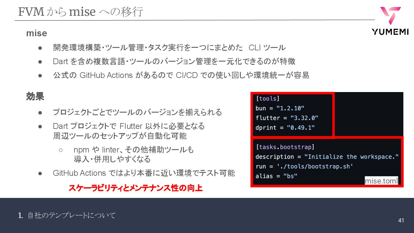 1. 自社のテンプレートについて FVM から mise への移行 mise • 開発環境構築・ツール管理・タスク実行を一つにまとめた CLI