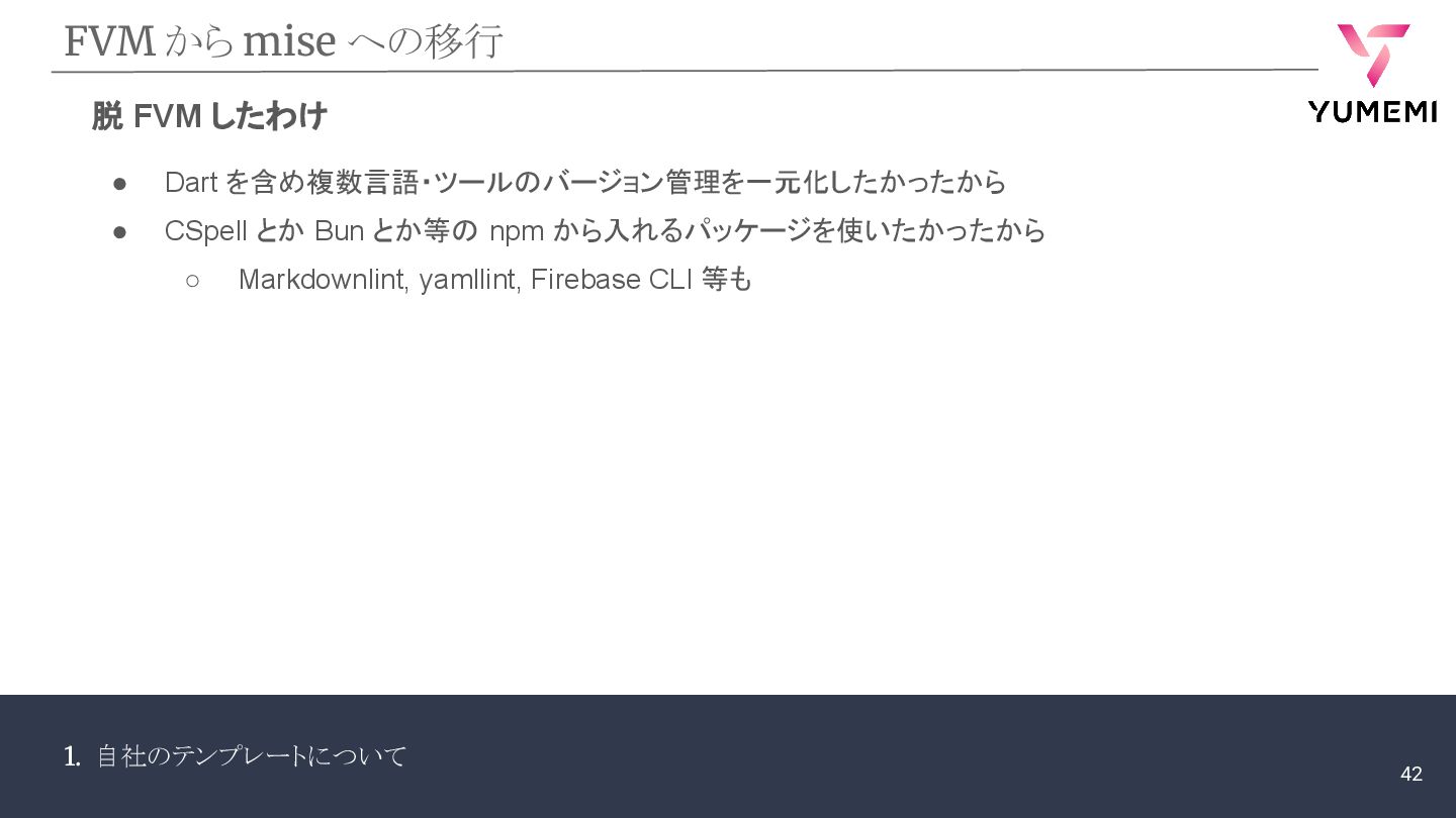 Dart を含め複数言語・ツールのバージョン管理を一元化したかったから • CSpell とか Bun とか等の npm から入れるパッケージを使いたかったから ◦ Markdownlint, yamllint, Firebase CLI 等も 42