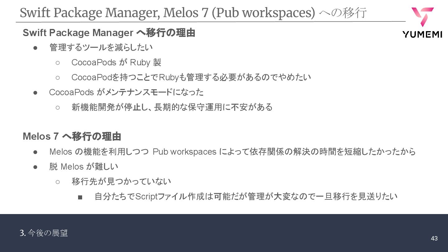 • 管理するツールを減らしたい ◦ CocoaPods が Ruby 製 ◦ CocoaPodを持つことでRubyも管理する必要があるのでやめたい • CocoaPods がメンテナンスモードになった ◦ 新機能開発が停止し、長期的な保守運用に不安がある Swift Package Manager へ移行の理由 Melos 7 へ移行の理由 • Melos の機能を利用しつつ Pub workspaces によって依存関係の解決の時間を短縮したかったから • 脱 Melos が難しい ◦ 移行先が見つかっていない ▪ 自分たちでScriptファイル作成は可能だが管理が大変なので一旦移行を見送りたい 43