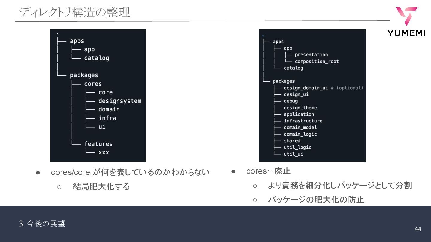 3. 今後の展望 ディレクトリ構造の整理 • cores/core が何を表しているのかわからない ◦ 結局肥大化する • cores~