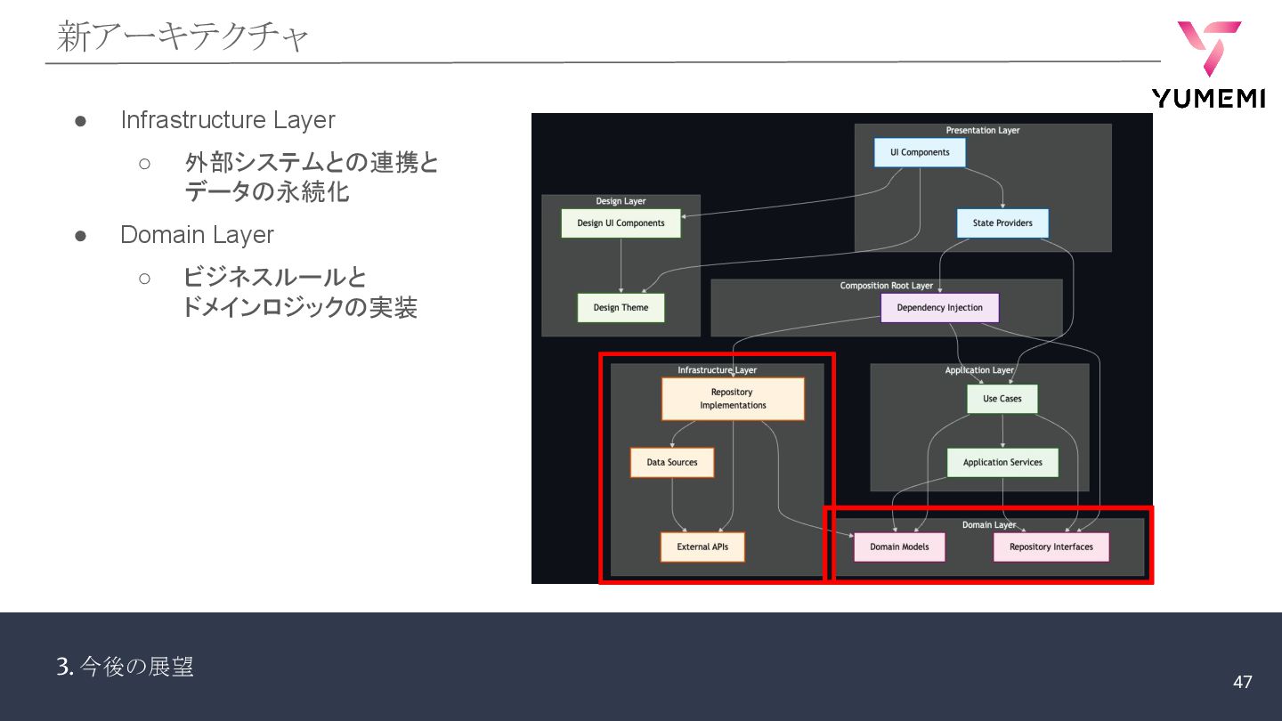 3. 今後の展望 新アーキテクチャ • Infrastructure Layer ◦ 外部システムとの連携と データの永続化 •