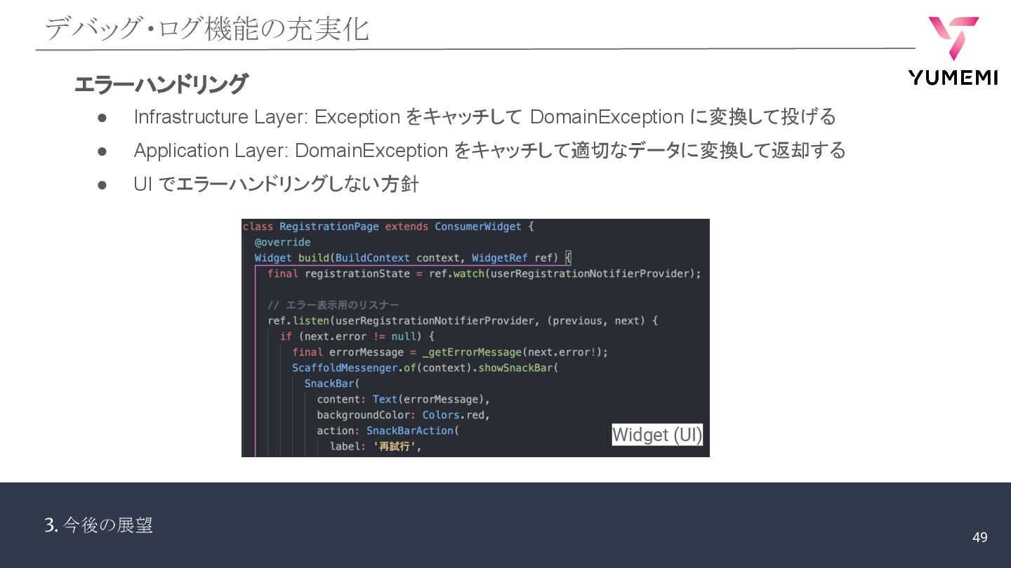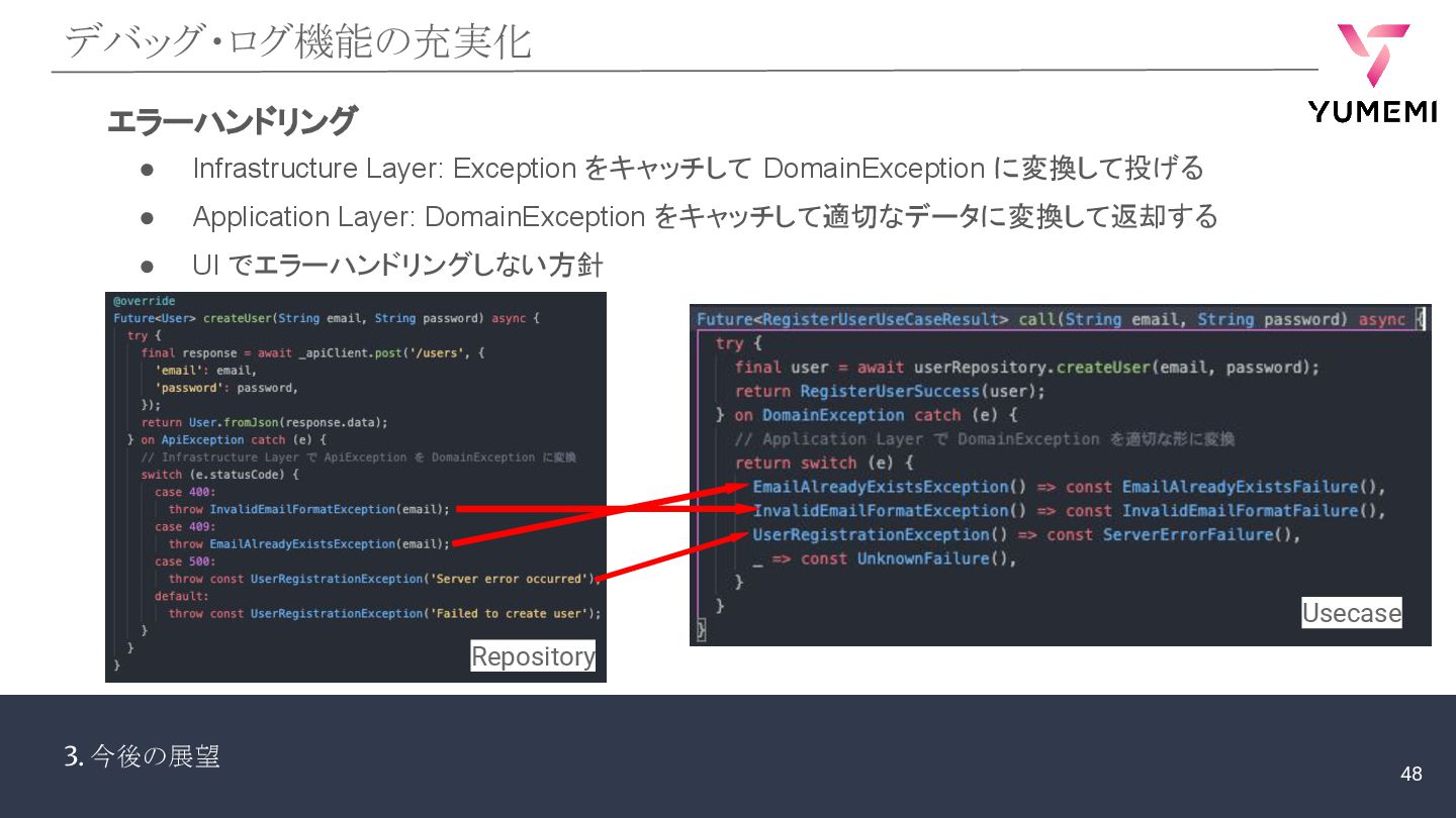3. 今後の展望 デバッグ・ログ機能の充実化 エラーハンドリング • Infrastructure Layer: Exception をキャッチして DomainException
