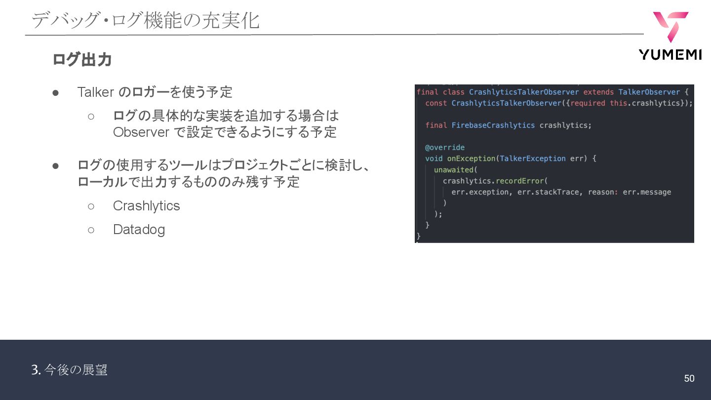 3. 今後の展望 デバッグ・ログ機能の充実化 ログ出力 • Talker のロガーを使う予定 ◦ ログの具体的な実装を追加する場合は Observer