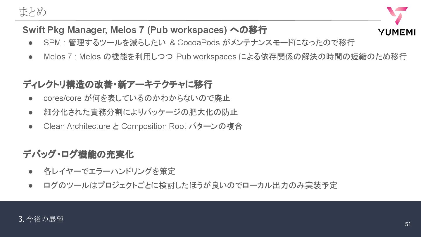 3. 今後の展望 まとめ Swift Pkg Manager, Melos 7 (Pub workspaces)