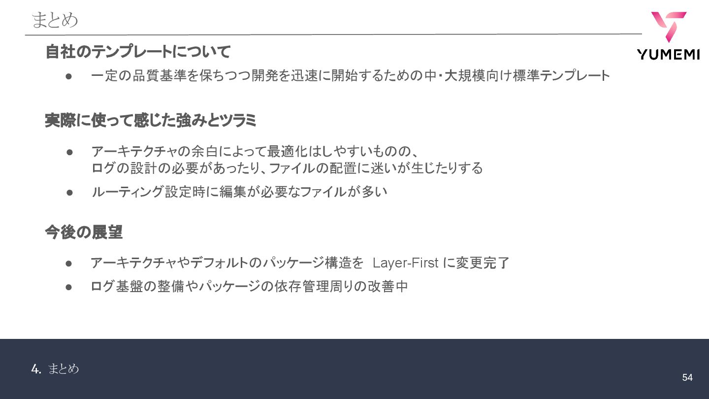 4. まとめ まとめ 自社のテンプレートについて • 一定の品質基準を保ちつつ開発を迅速に開始するための中・大規模向け標準テンプレート 今後の展望 • アーキテクチャやデフォルトのパッケージ構造を Layer-First