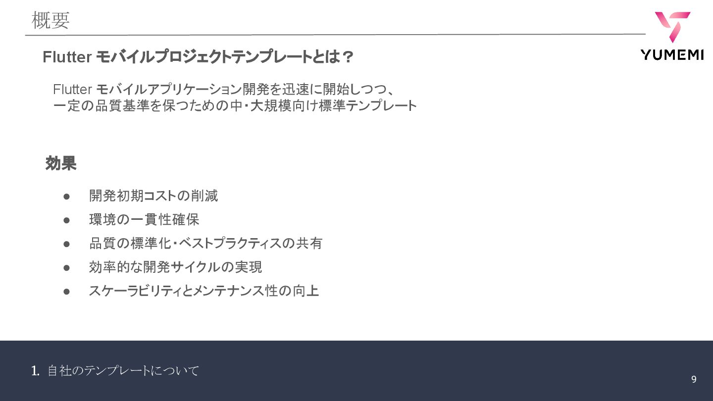 1. 自社のテンプレートについて 概要 Flutter モバイルアプリケーション開発を迅速に開始しつつ、 一定の品質基準を保つための中・大規模向け標準テンプレート Flutter モバイルプロジェクトテンプレートとは? • 開発初期コストの削減