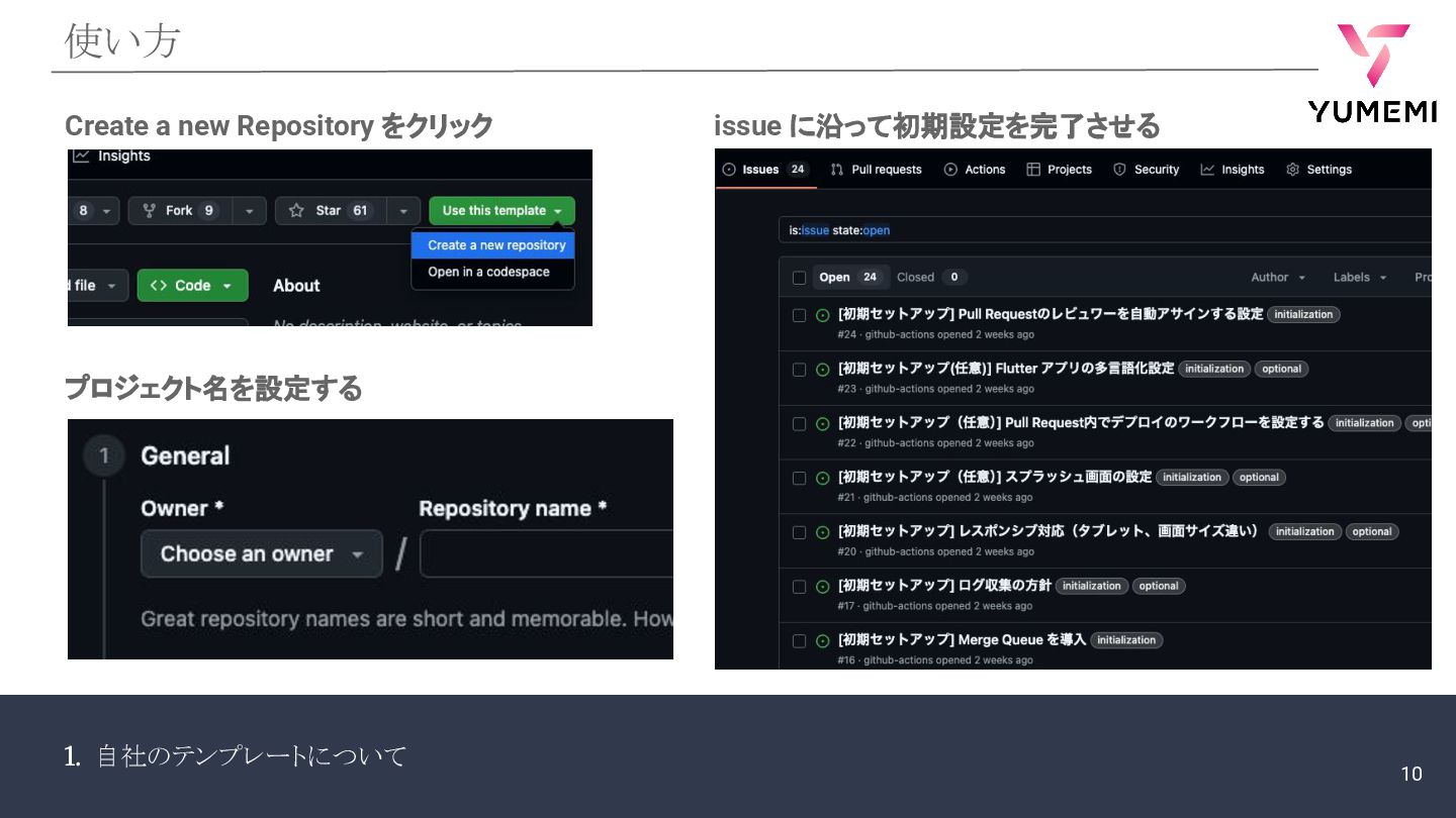 1. 自社のテンプレートについて 使い方 Create a new Repository をクリック プロジェクト名を設定する issue